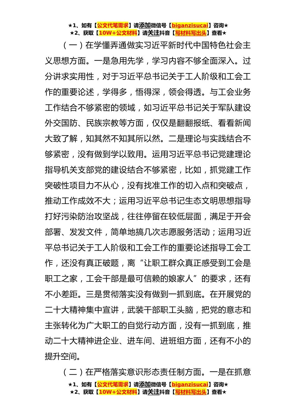 ★1、如有【公文代笔需求】请添加微信号【biganzisucai】咨询★★2、获取【10W+公文材料】请关注抖音【写材料写出头】查看★根据《关于开好2023年上半年党员领导干部民主生活会的通知》要求,我积极参加×××党组理论学习中心组专题学习研讨会,聚焦省委巡视边巡边改问题整改,深入学习习近平新时代中国特色社会主义思想和党的二十大精神等学习了原文原著,进行了研讨交流,提高了思想认识;深入征求意见,开展谈心谈话,广泛征求意见建议,对照党员标准深刻剖析了自身存在的问题。联系自己的思想和工作实际,进行了对照检查,认真剖析思想根源,明确了努力方向和整改措施。一、边巡边改问题整改情况深入贯彻落实巡视组《关于做好边巡边改工作的通知》精神,对照提出的5个方面的问题,立足工作职责,立即行动,举...