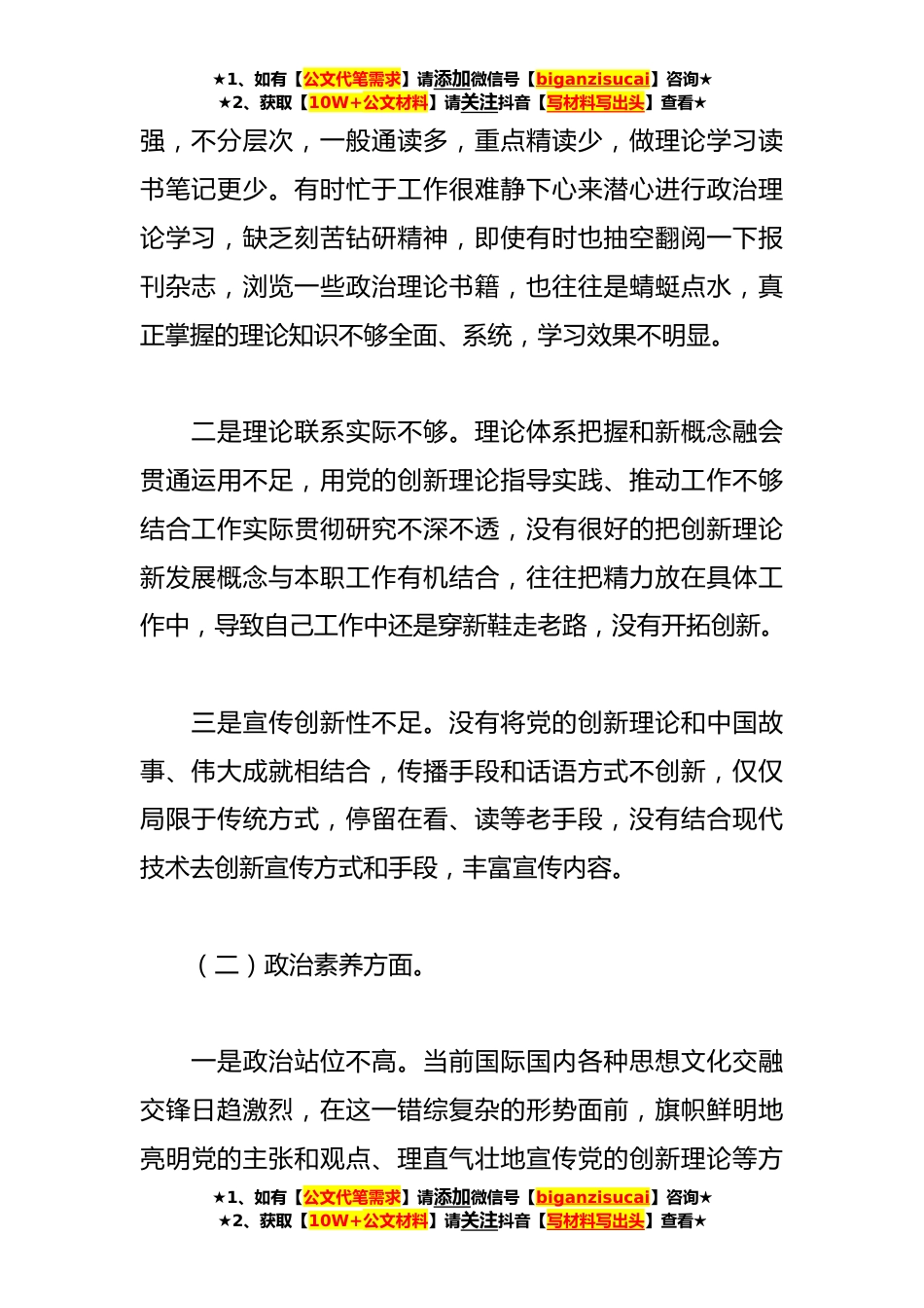 ★1、如有【公文代笔需求】请添加微信号【biganzisucai】咨询★★2、获取【10W+公文材料】请关注抖音【写材料写出头】查看★2023年主题教育专题民主生活会党员个人对照检查材料按照上级对本次民主生活会的有关要求,本人结合学习、工作、生活等实际情况,紧紧围绕学习贯彻A新时代中国特色社会主义思想主题,聚焦六个方面开展对照检查深刻反思、深入查找自身存在的问题,并对存在问题的原因进行了深层次剖析及提出相应整改措施。下面我将个人对照检查材料汇报如下,不妥之处请各位领导和同志们批评指正。一、存在问题(一)理论学习方面。一是对党的创新理论学习不够深入。对党的创新理论武装头脑的紧迫性认识不足,理论学习不够重视,学习自觉性、积极性和主动性不足,学习专题不突出,针对性不★1、如有【公文代...