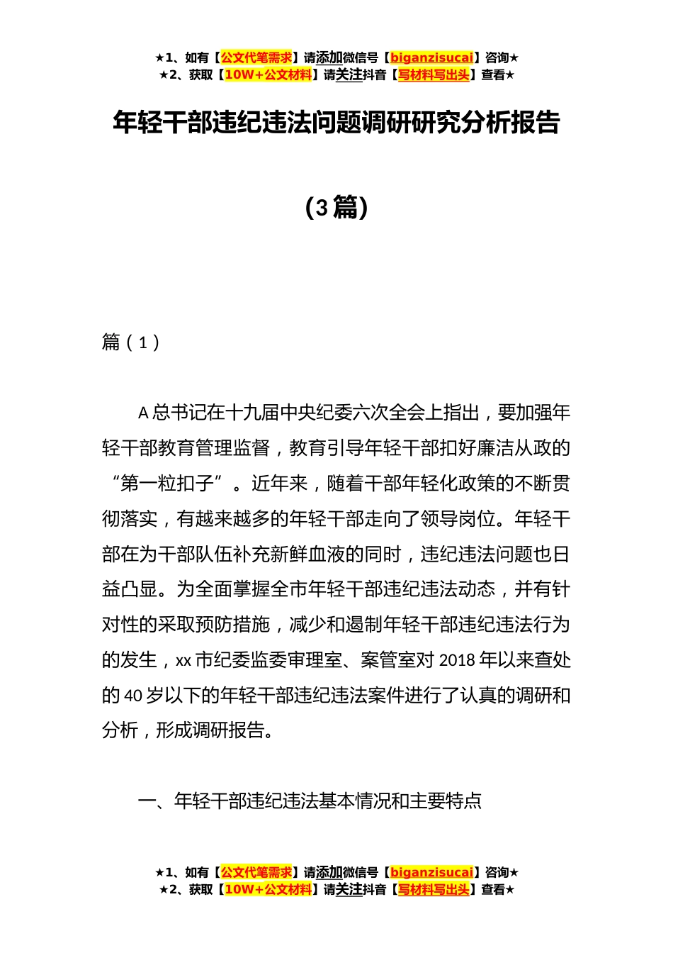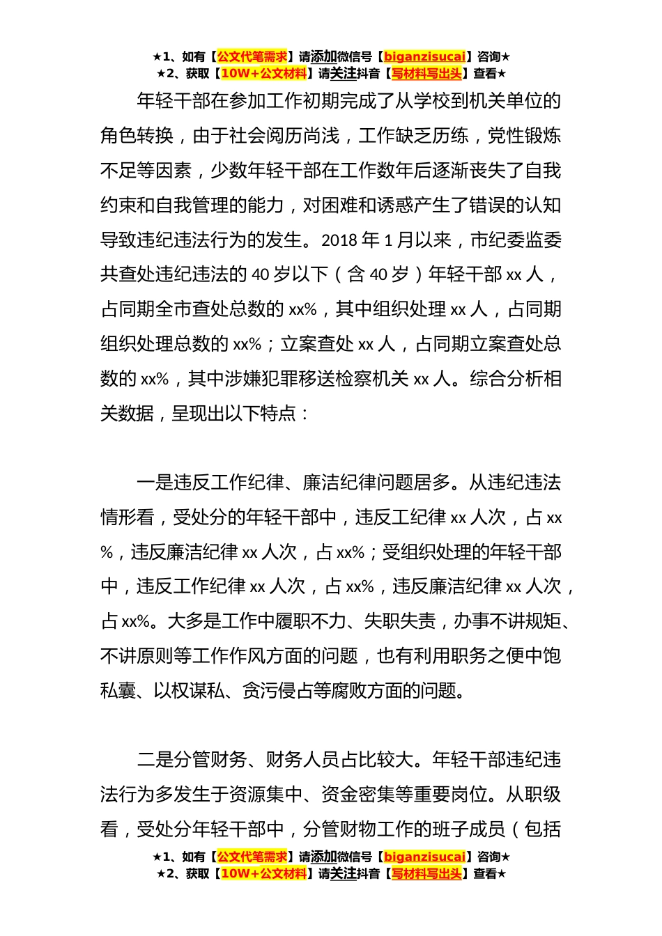 ★1、如有【公文代笔需求】请添加微信号【biganzisucai】咨询★★2、获取【10W+公文材料】请关注抖音【写材料写出头】查看★年轻干部违纪违法问题调研研究分析报告(3篇)篇(1)A总书记在十九届中央纪委六次全会上指出,要加强年轻干部教育管理监督,教育引导年轻干部扣好廉洁从政的“第一粒扣子”。近年来,随着干部年轻化政策的不断贯彻落实,有越来越多的年轻干部走向了领导岗位。年轻干部在为干部队伍补充新鲜血液的同时,违纪违法问题也日益凸显。为全面掌握全市年轻干部违纪违法动态,并有针对性的采取预防措施,减少和遏制年轻干部违纪违法行为的发生,xx市纪委监委审理室、案管室对2018年以来查处的40岁以下的年轻干部违纪违法案件进行了认真的调研和分析,形成调研报告。一、年轻干部违纪违法基本情况和...