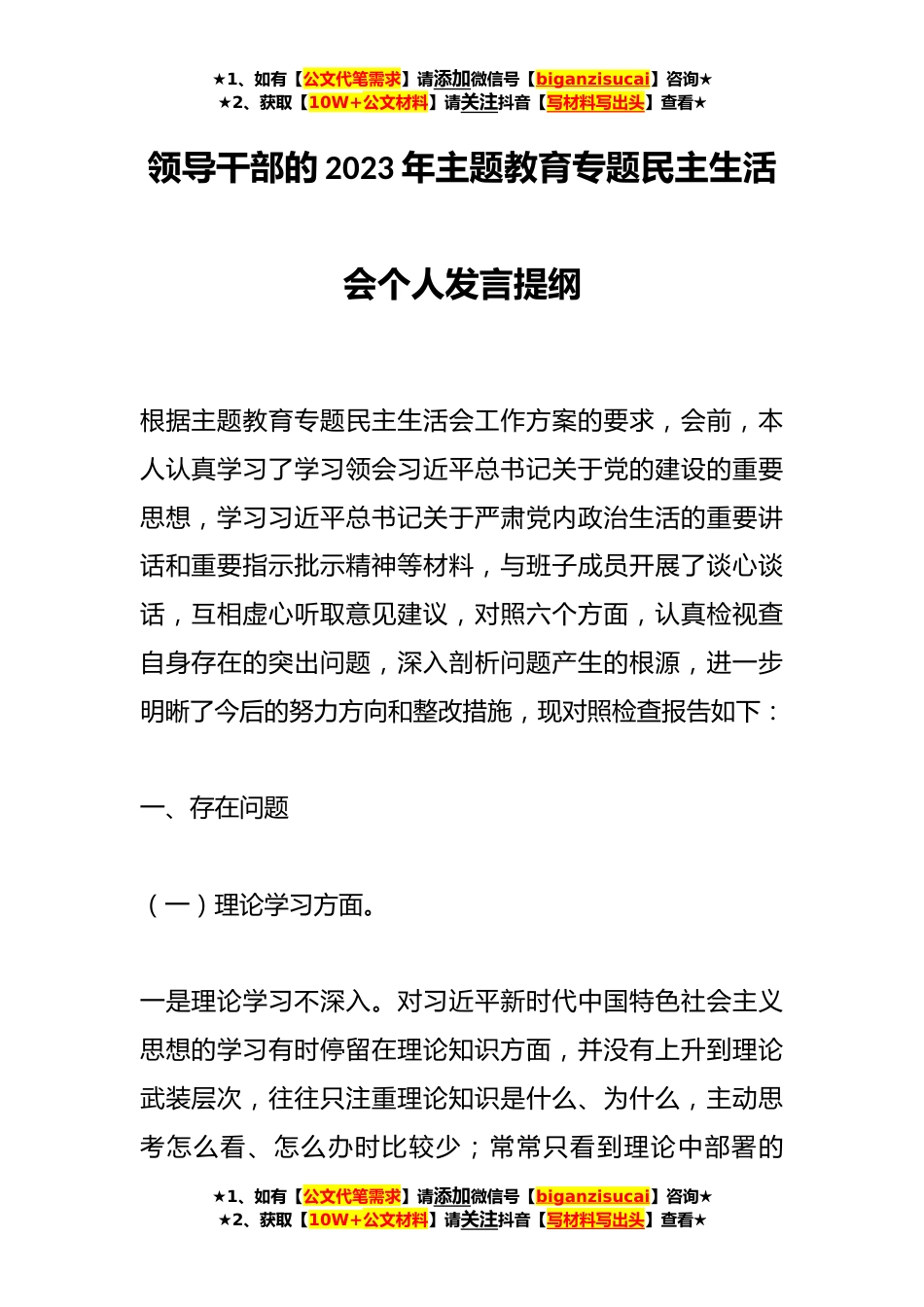 ★1、如有【公文代笔需求】请添加微信号【biganzisucai】咨询★★2、获取【10W+公文材料】请关注抖音【写材料写出头】查看★领导干部的2023年主题教育专题民主生活会个人发言提纲根据主题教育专题民主生活会工作方案的要求,会前,本人认真学习了学习领会习近平总书记关于党的建设的重要思想,学习习近平总书记关于严肃党内政治生活的重要讲话和重要指示批示精神等材料,与班子成员开展了谈心谈话,互相虚心听取意见建议,对照六个方面,认真检视查自身存在的突出问题,深入剖析问题产生的根源,进一步明晰了今后的努力方向和整改措施,现对照检查报告如下:一、存在问题(一)理论学习方面。一是理论学习不深入。对习近平新时代中国特色社会主义思想的学习有时停留在理论知识方面,并没有上升到理论武装层次,往...