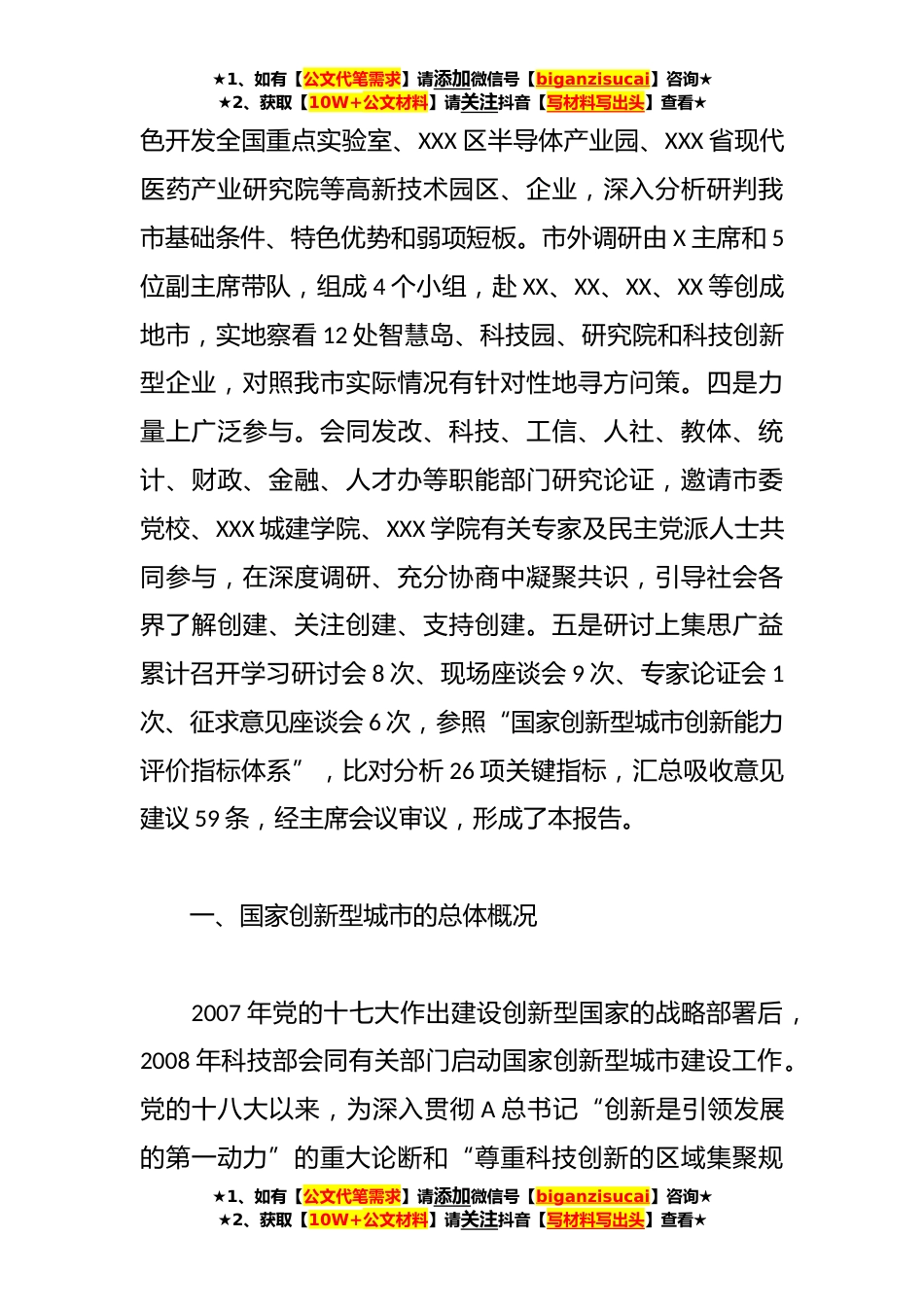 ★1、如有【公文代笔需求】请添加微信号【biganzisucai】咨询★★2、获取【10W+公文材料】请关注抖音【写材料写出头】查看★关于“创建国家创新型城市”的调研报告为认真贯彻党的XX大关于实现高水平科技自立自强,进入创新型国家前列的战略擘画,深入践行A总书记视察XXX重要讲话重要指示精神,全面落实中央、省委、市委决策部署,助推我市早日迈入国家创新型城市行列,按照市委主要领导要求,市政协围绕“创建国家创新型城市”开展了专题调研。1个半月的调研过程,主要体现五个特点:一是思想上高度重视。党组书记、主席XXX同志亲自谋划部署、领衔工作专班,主持召开党组会议、主席会议认真研究调研方案,要求将本次调研作为十届市政协开局之年的“一号工程”,作为落实《中国共产党政治协商工作条例》的有力抓手...