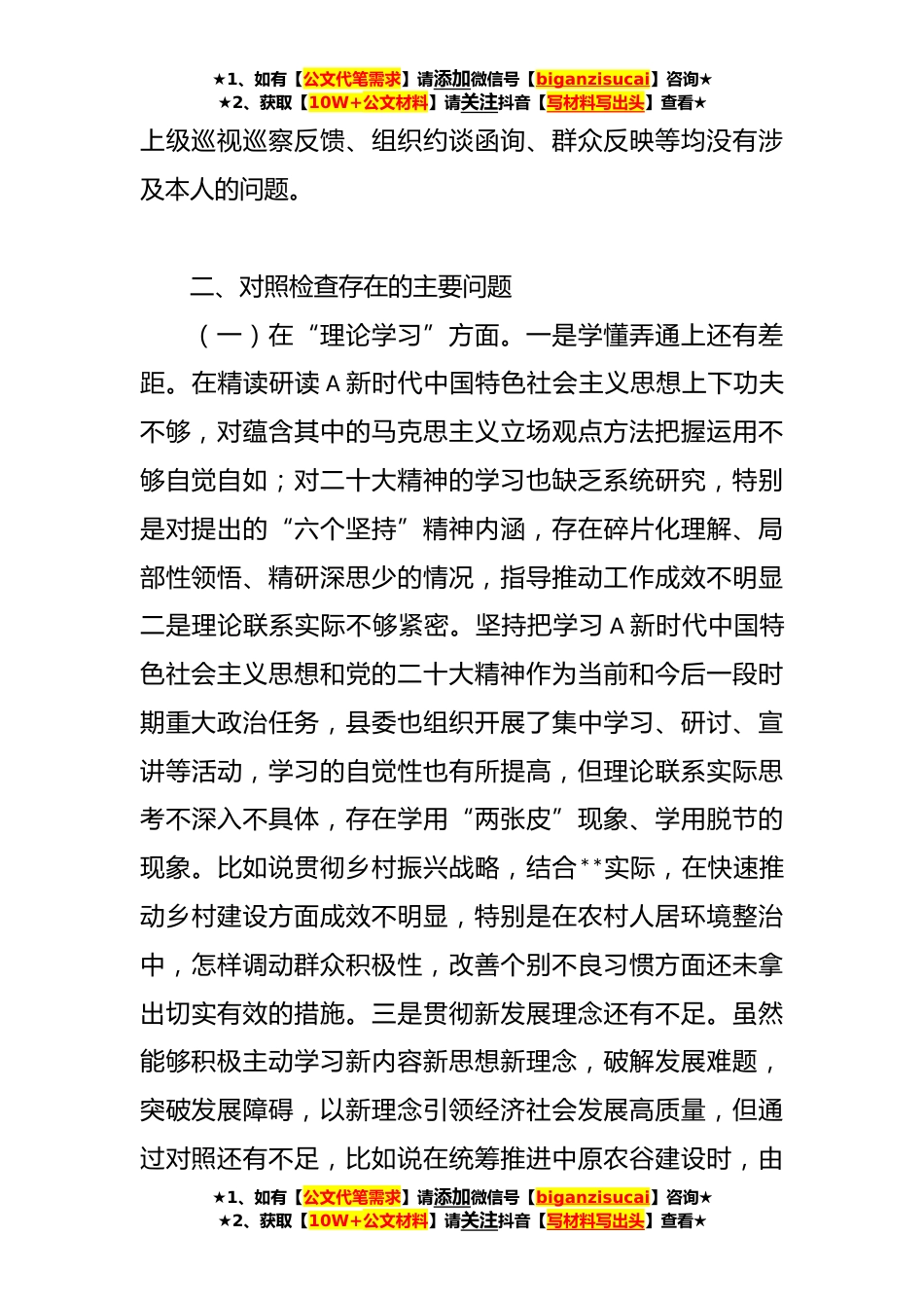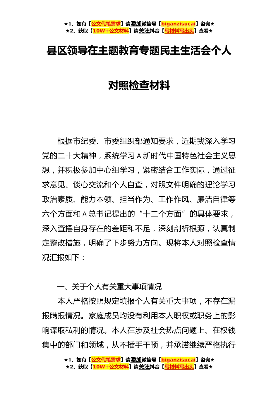 ★1、如有【公文代笔需求】请添加微信号【biganzisucai】咨询★★2、获取【10W+公文材料】请关注抖音【写材料写出头】查看★县区领导在主题教育专题民主生活会个人对照检查材料根据市纪委、市委组织部通知要求,近期我深入学习党的二十大精神,系统学习A新时代中国特色社会主义思想,并积极参加中心组学习,紧密结合工作实际,通过征求意见、谈心交流和个人自查,对照文件明确的理论学习政治素质、能力本领、担当作为、工作作风、廉洁自律等六个方面和A总书记提出的“十二个方面”的具体要求,深入查摆自身存在的差距和不足,深刻剖析根源,认真制定整改措施,明确了下步努力方向。现将本人对照检查情况汇报如下:一、关于个人有关重大事项情况本人严格按照规定填报个人有关重大事项,不存在漏报瞒报情况。家庭成...