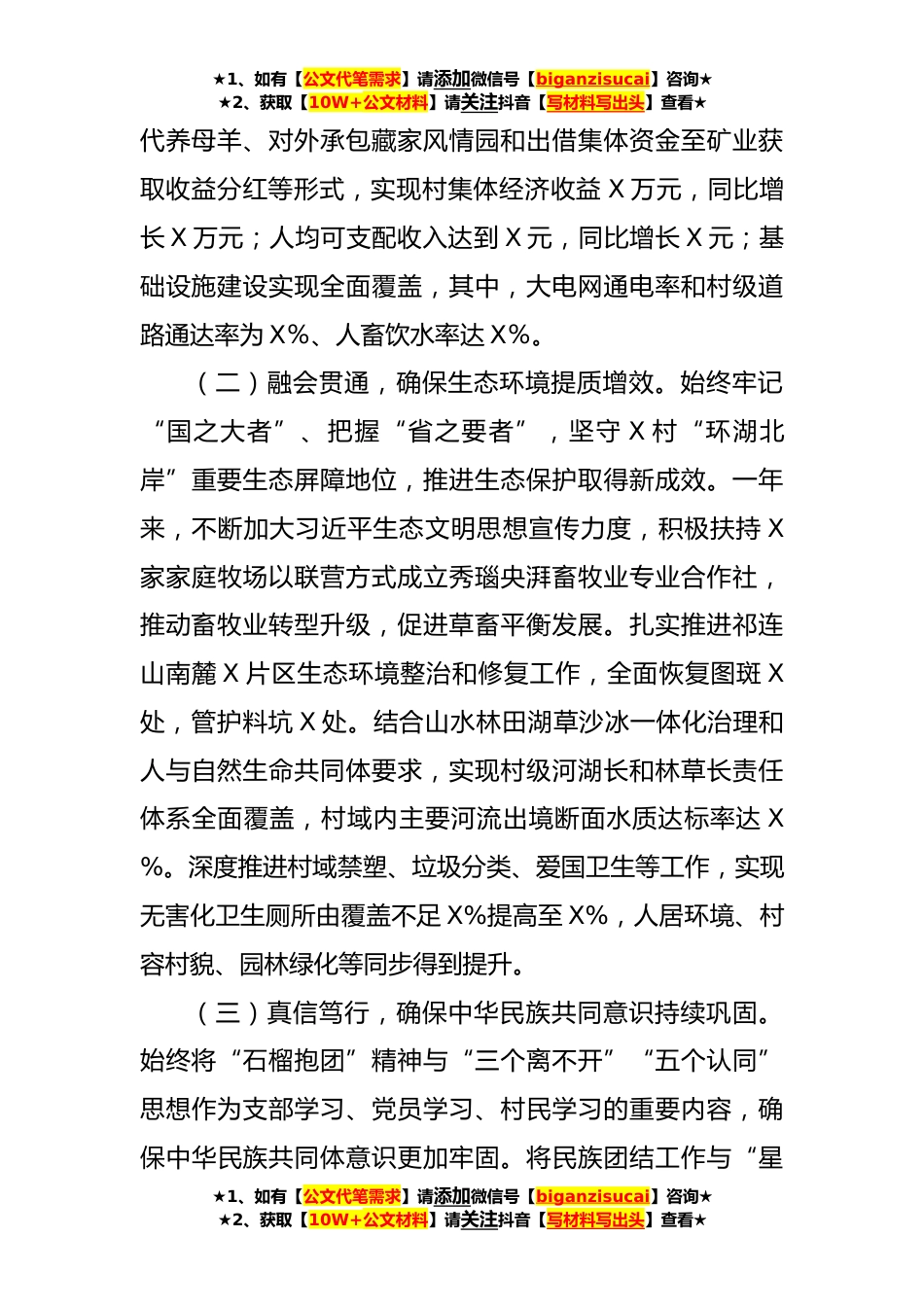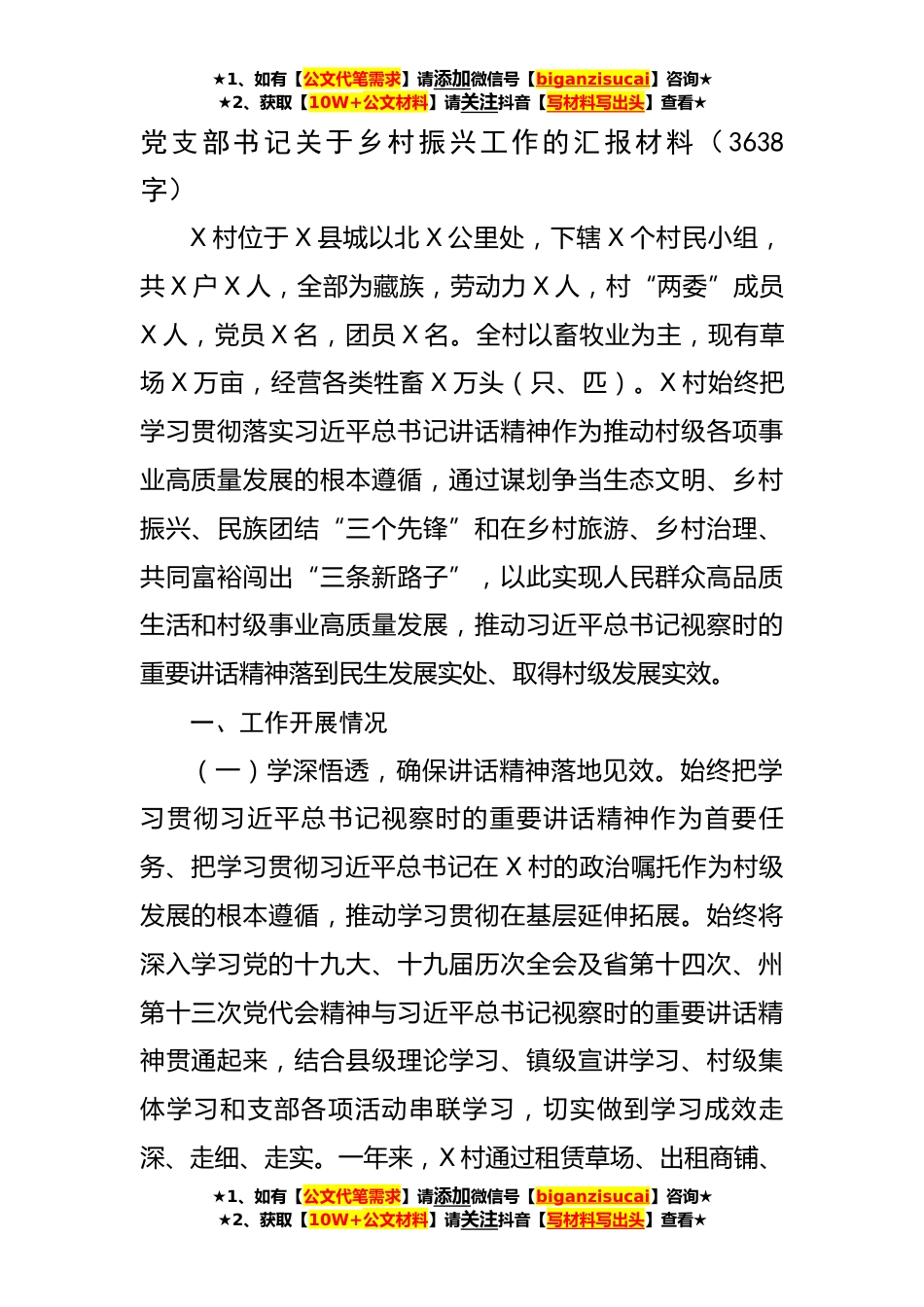 ★1、如有【公文代笔需求】请添加微信号【biganzisucai】咨询★★2、获取【10W+公文材料】请关注抖音【写材料写出头】查看★党支部书记关于乡村振兴工作的汇报材料(3638字)X村位于X县城以北X公里处,下辖X个村民小组,共X户X人,全部为藏族,劳动力X人,村“两委”成员X人,党员X名,团员X名。全村以畜牧业为主,现有草场X万亩,经营各类牲畜X万头(只、匹)。X村始终把学习贯彻落实习近平总书记讲话精神作为推动村级各项事业高质量发展的根本遵循,通过谋划争当生态文明、乡村振兴、民族团结“三个先锋”和在乡村旅游、乡村治理、共同富裕闯出“三条新路子”,以此实现人民群众高品质生活和村级事业高质量发展,推动习近平总书记视察时的重要讲话精神落到民生发展实处、取得村级发展实效。一、工作开展情况(一...
