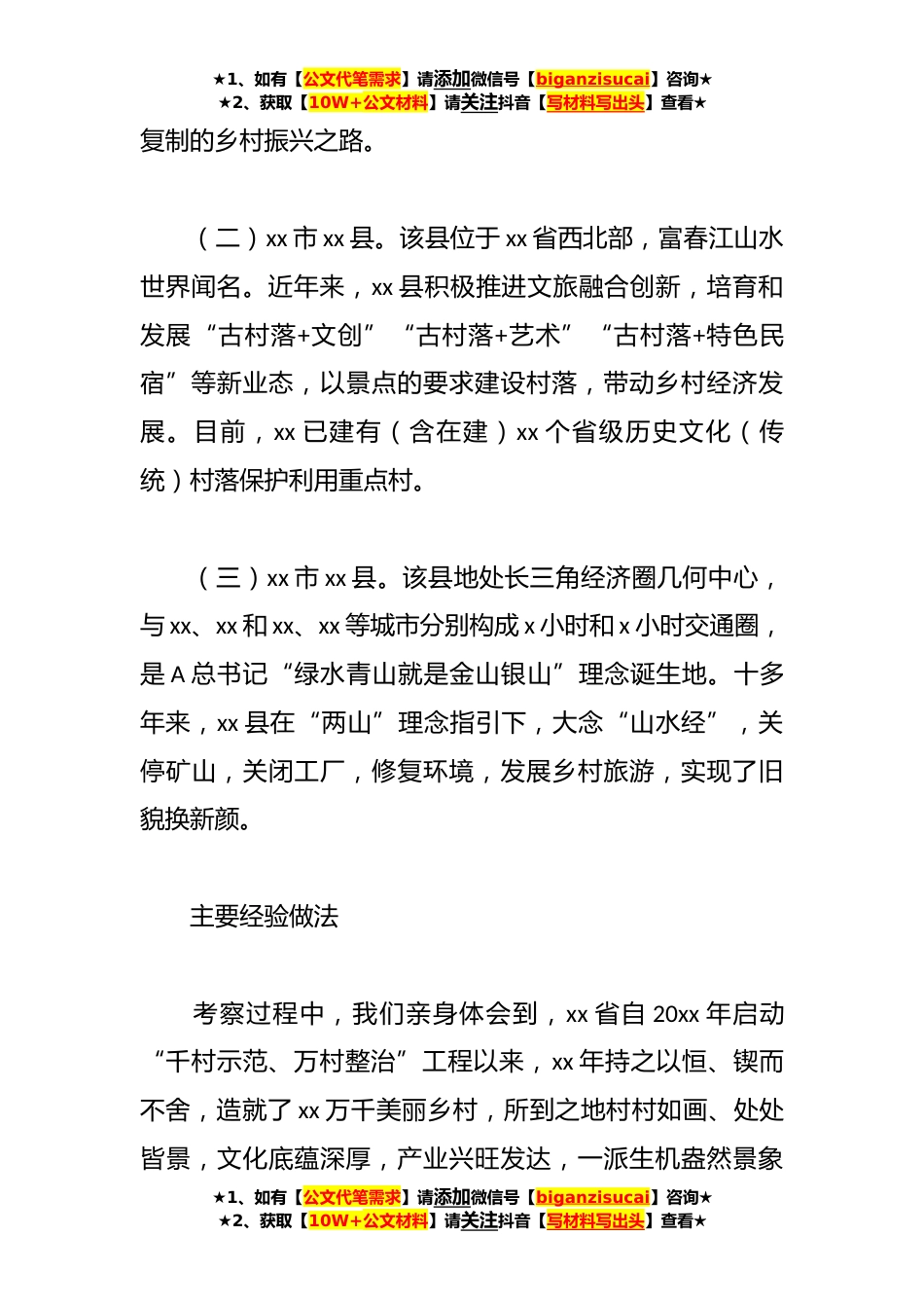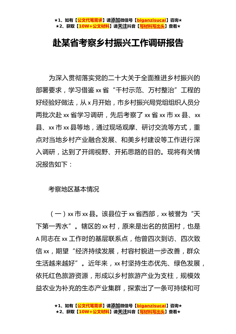 ★1、如有【公文代笔需求】请添加微信号【biganzisucai】咨询★★2、获取【10W+公文材料】请关注抖音【写材料写出头】查看★赴某省考察乡村振兴工作调研报告为深入贯彻落实党的二十大关于全面推进乡村振兴的部署要求,学习借鉴xx省“千村示范、万村整治”工程的好经验好做法,从x月开始,市乡村振兴局党组组织人员分两批次赴xx省学习调研,先后考察了xx省xx市xx县、xx县、xx市xx县等地,通过现场观摩、研讨交流等方式,重点对当地乡村产业融合发展、和美乡村建设等工作进行深入调研,达到了开阔视野、开拓思路的目的。现将有关情况报告如下:考察地区基本情况(一)xx市xx县。该县位于xx省西部,xx被誉为“天下第一秀水”。辖区的xx村,原来是出名的贫困村,也是A同志在xx工作时的基层联系点,他曾四次到访、四次...
