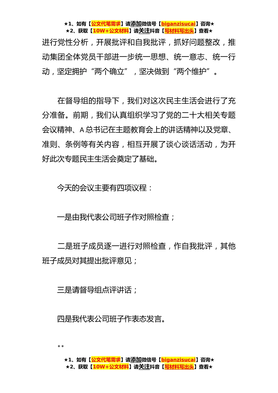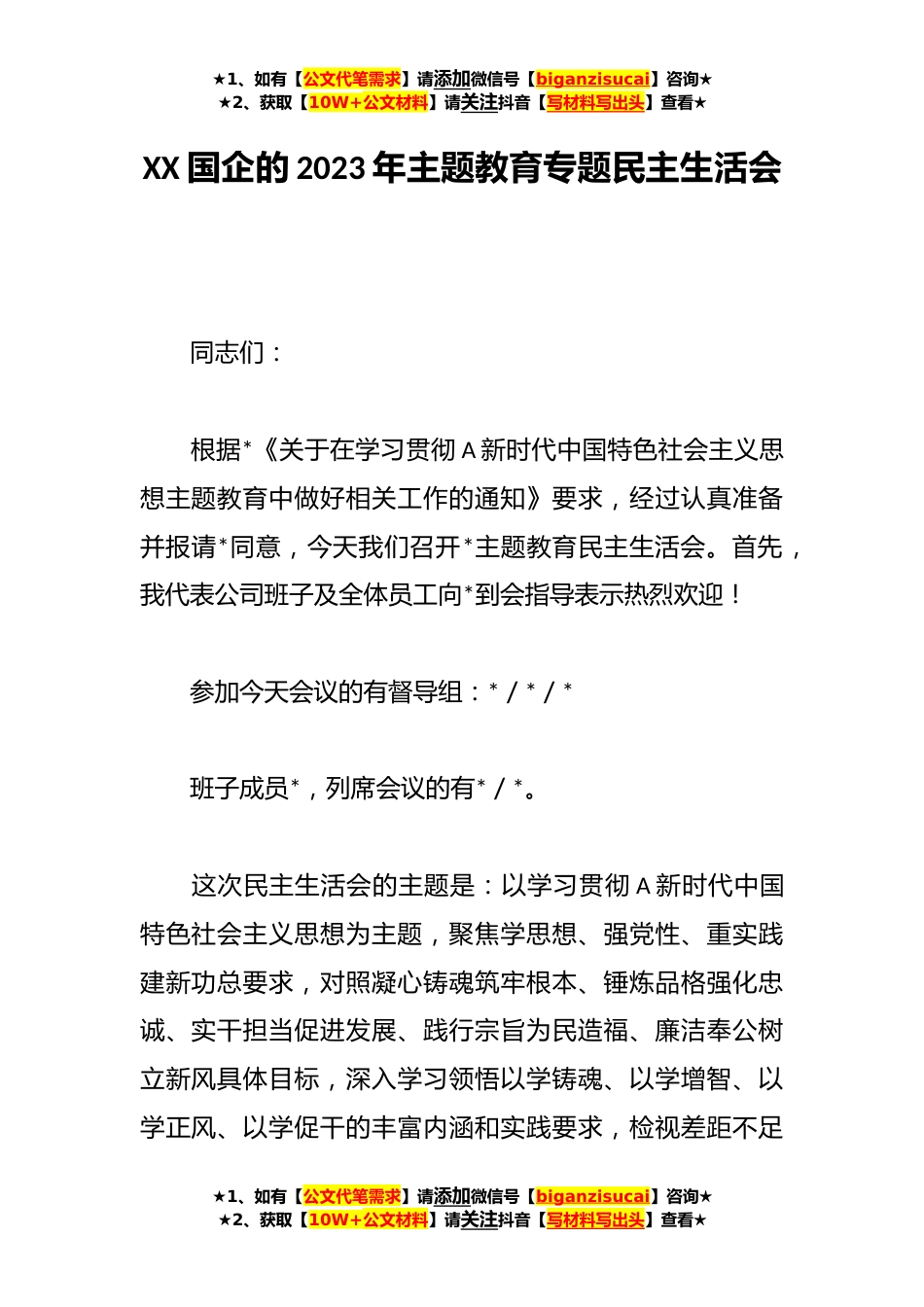 ★1、如有【公文代笔需求】请添加微信号【biganzisucai】咨询★★2、获取【10W+公文材料】请关注抖音【写材料写出头】查看★XX国企的2023年主题教育专题民主生活会同志们:根据*《关于在学习贯彻A新时代中国特色社会主义思想主题教育中做好相关工作的通知》要求,经过认真准备并报请*同意,今天我们召开*主题教育民主生活会。首先,我代表公司班子及全体员工向*到会指导表示热烈欢迎!参加今天会议的有督导组:*/*/*班子成员*,列席会议的有*/*。这次民主生活会的主题是:以学习贯彻A新时代中国特色社会主义思想为主题,聚焦学思想、强党性、重实践建新功总要求,对照凝心铸魂筑牢根本、锤炼品格强化忠诚、实干担当促进发展、践行宗旨为民造福、廉洁奉公树立新风具体目标,深入学习领悟以学铸魂、以学增智、以...