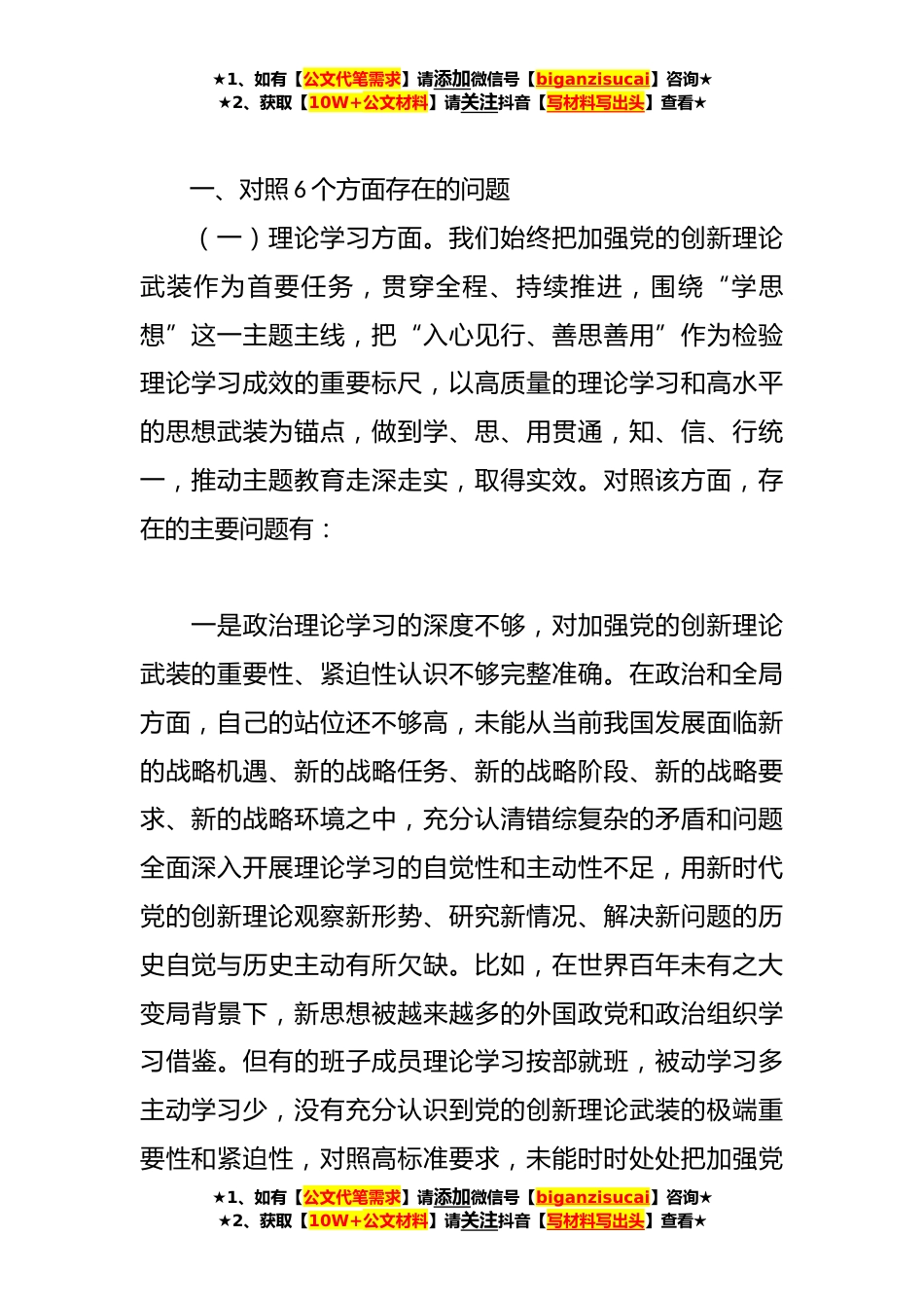 ★1、如有【公文代笔需求】请添加微信号【biganzisucai】咨询★★2、获取【10W+公文材料】请关注抖音【写材料写出头】查看★在2023年主题教育专题民主生活会班子对照检查根据*关于召开学习贯彻A新时代中国特色社会主义思想主题教育专题民主生活会的通知精神,局党组深刻认识用A新时代中国特色社会主义思想凝心铸魂的重大意义,牢牢把握“学思想、强党性、重实践、建新功”的总要求在主题教育专题民主生活会前,再次进行专题集体学习,在主题教育理论学习的基础上对各方面内容进行深入学、融汇学、贯通学,坚持不懈用A新时代中国特色社会主义思想凝心铸魂,为开好专题民主生活会打牢思想基础。局党组成员召开专题会议,对照“理论学习、政治素质、能力本领、担当作为、工作作风、廉洁自律”等六个方面,认真查找梳...