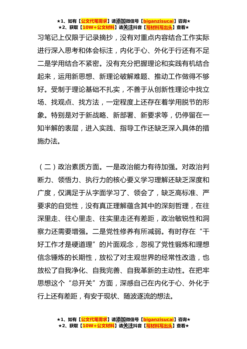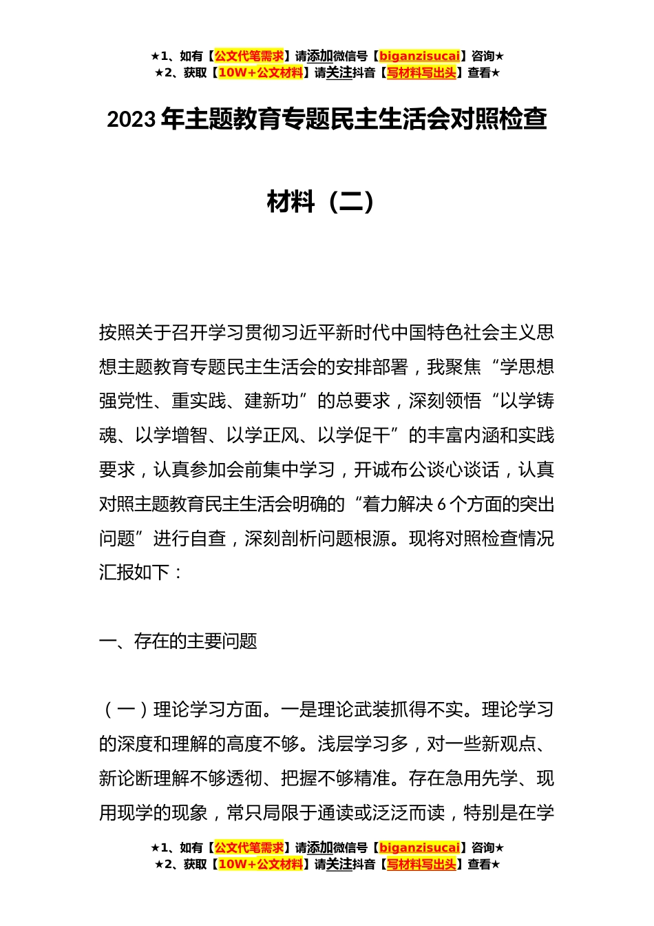 ★1、如有【公文代笔需求】请添加微信号【biganzisucai】咨询★★2、获取【10W+公文材料】请关注抖音【写材料写出头】查看★2023年主题教育专题民主生活会对照检查材料(二)按照关于召开学习贯彻习近平新时代中国特色社会主义思想主题教育专题民主生活会的安排部署,我聚焦“学思想强党性、重实践、建新功”的总要求,深刻领悟“以学铸魂、以学增智、以学正风、以学促干”的丰富内涵和实践要求,认真参加会前集中学习,开诚布公谈心谈话,认真对照主题教育民主生活会明确的“着力解决6个方面的突出问题”进行自查,深刻剖析问题根源。现将对照检查情况汇报如下:一、存在的主要问题(一)理论学习方面。一是理论武装抓得不实。理论学习的深度和理解的高度不够。浅层学习多,对一些新观点、新论断理解不够透彻、把...