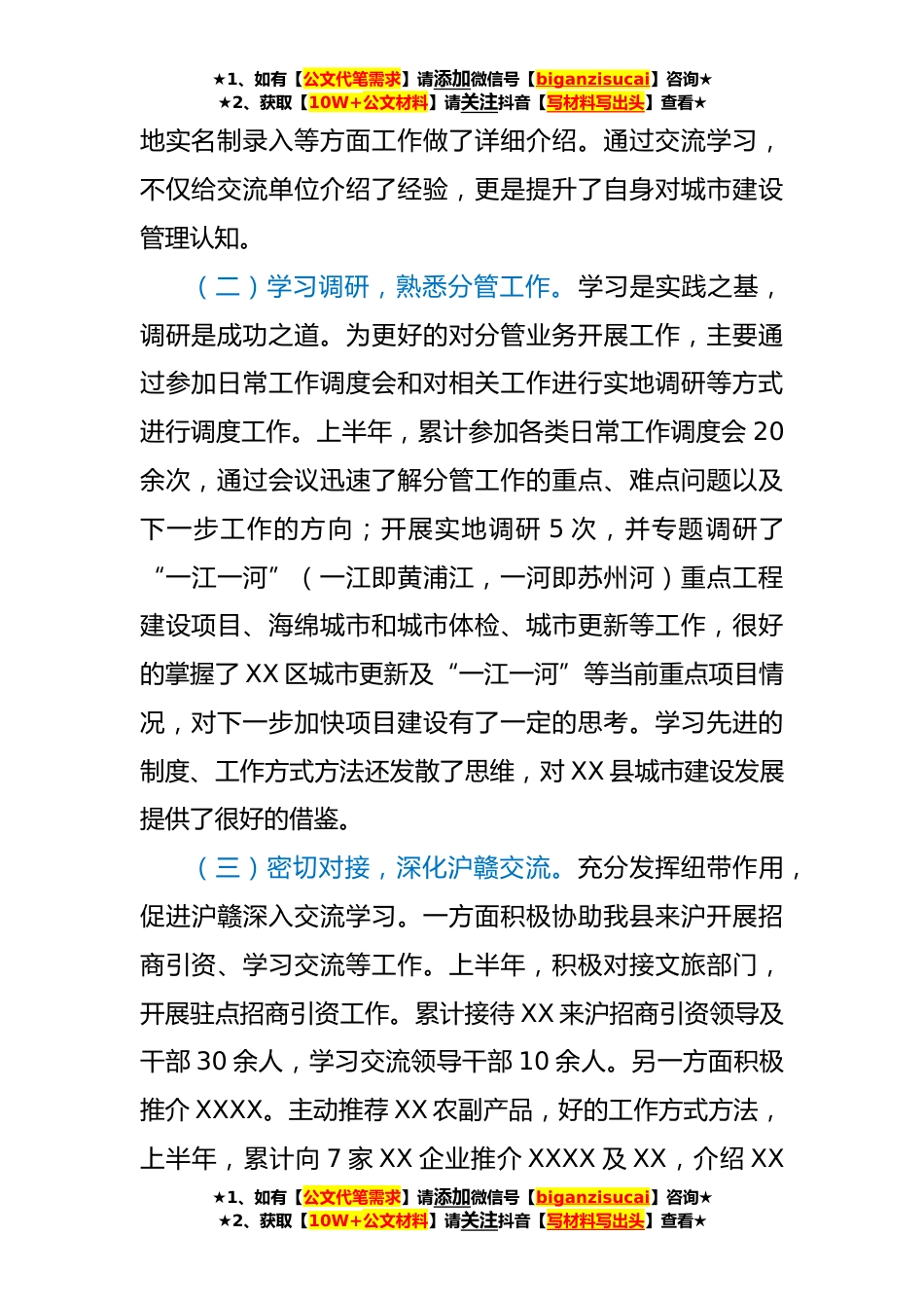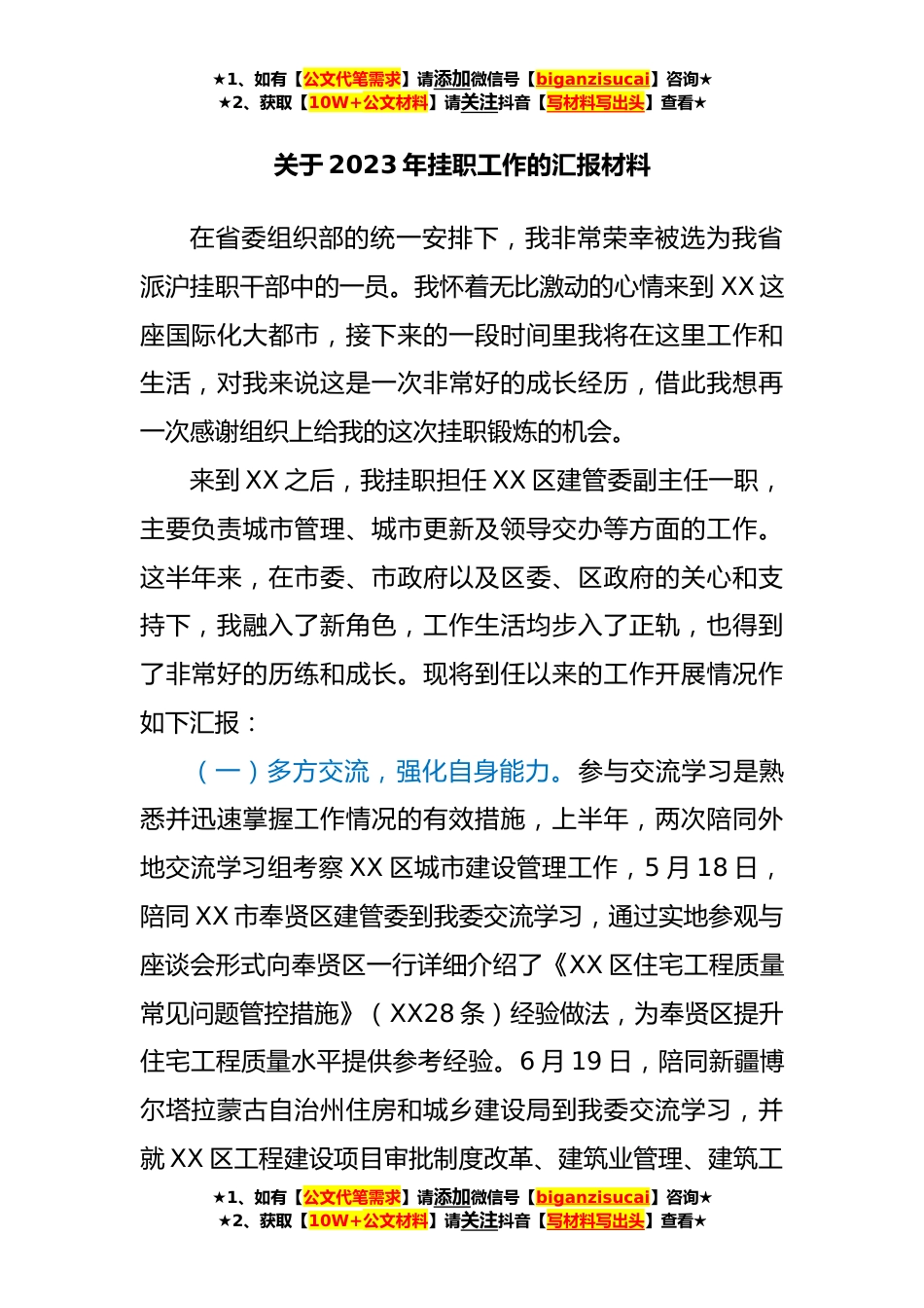★1、如有【公文代笔需求】请添加微信号【biganzisucai】咨询★★2、获取【10W+公文材料】请关注抖音【写材料写出头】查看★关于2023年挂职工作的汇报材料在省委组织部的统一安排下,我非常荣幸被选为我省派沪挂职干部中的一员。我怀着无比激动的心情来到XX这座国际化大都市,接下来的一段时间里我将在这里工作和生活,对我来说这是一次非常好的成长经历,借此我想再一次感谢组织上给我的这次挂职锻炼的机会。来到XX之后,我挂职担任XX区建管委副主任一职,主要负责城市管理、城市更新及领导交办等方面的工作。这半年来,在市委、市政府以及区委、区政府的关心和支持下,我融入了新角色,工作生活均步入了正轨,也得到了非常好的历练和成长。现将到任以来的工作开展情况作如下汇报:(一)多方交流,强化自身能力...