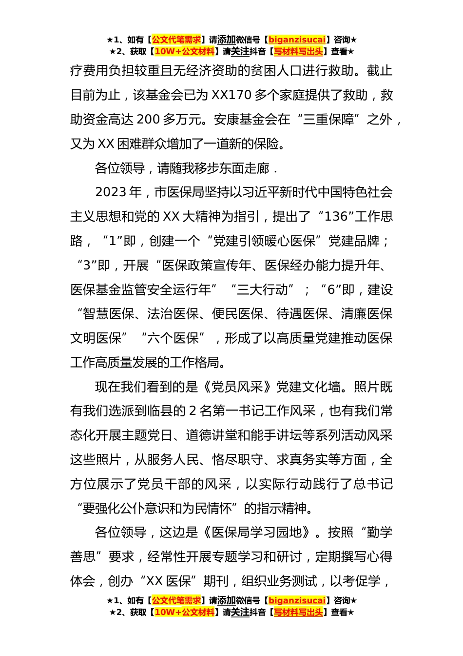 ★1、如有【公文代笔需求】请添加微信号【biganzisucai】咨询★★2、获取【10W+公文材料】请关注抖音【写材料写出头】查看★关于2023年市医疗保障局工作的解说词尊敬的各位领导:大家好!欢迎莅临医保局指导工作。我是市医保局×××,今天很荣幸由我为大家作介绍。各位领导,请看这边:XX市医保局坚持以党的XX大精神和习近平新时代中国特色社会主义思想为指引,每年都会评选出数名优秀工作者、优秀共产党员进行通报表彰并通过《先锋模范光荣榜》予以宣传,切实把“六个坚持”贯彻落实到医保工作的方方面面,形成了以高质量党建引领医保工作高质量发展的工作格局。各位领导,这边是我们医保局创建的“党建引领暖心医保”党建品牌。里边有党建品牌LOGO和具体内容。XX市医保局坚持以人民为中心的发展思想,从“建设...