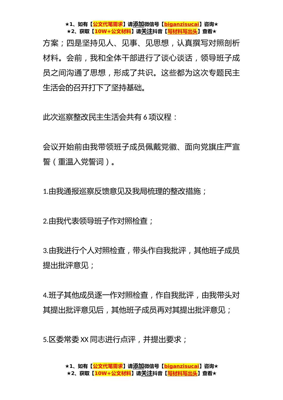 ★1、如有【公文代笔需求】请添加微信号【biganzisucai】咨询★★2、获取【10W+公文材料】请关注抖音【写材料写出头】查看★2023年的巡察整改专题民主生活会主持词同志们:大家好!今天我们召开区XX局巡察整改专题民主生活会。这次民主生活会以习近平新时代中国特色社会主义思想和党的XX大精神为指导,聚焦区委巡察反馈问题,局领导班子和班子成员深刻剖析原因,进一步明确努力方向,确保真改实改整改工作见底到位。区委常委XX同志专程到会指导,区委第五巡察组组长XX同志,区纪委监委干部XX同志,区委组织部干部XX同志列席指导会议,让我们以热烈的掌声表示欢迎!为开好这次民主生活会,前期局领导班子成员严格按照有关通知要求,做了充分准备。一是坚持读原文、悟真理,认真学习有关内容;二是坚持摆进去、真反...