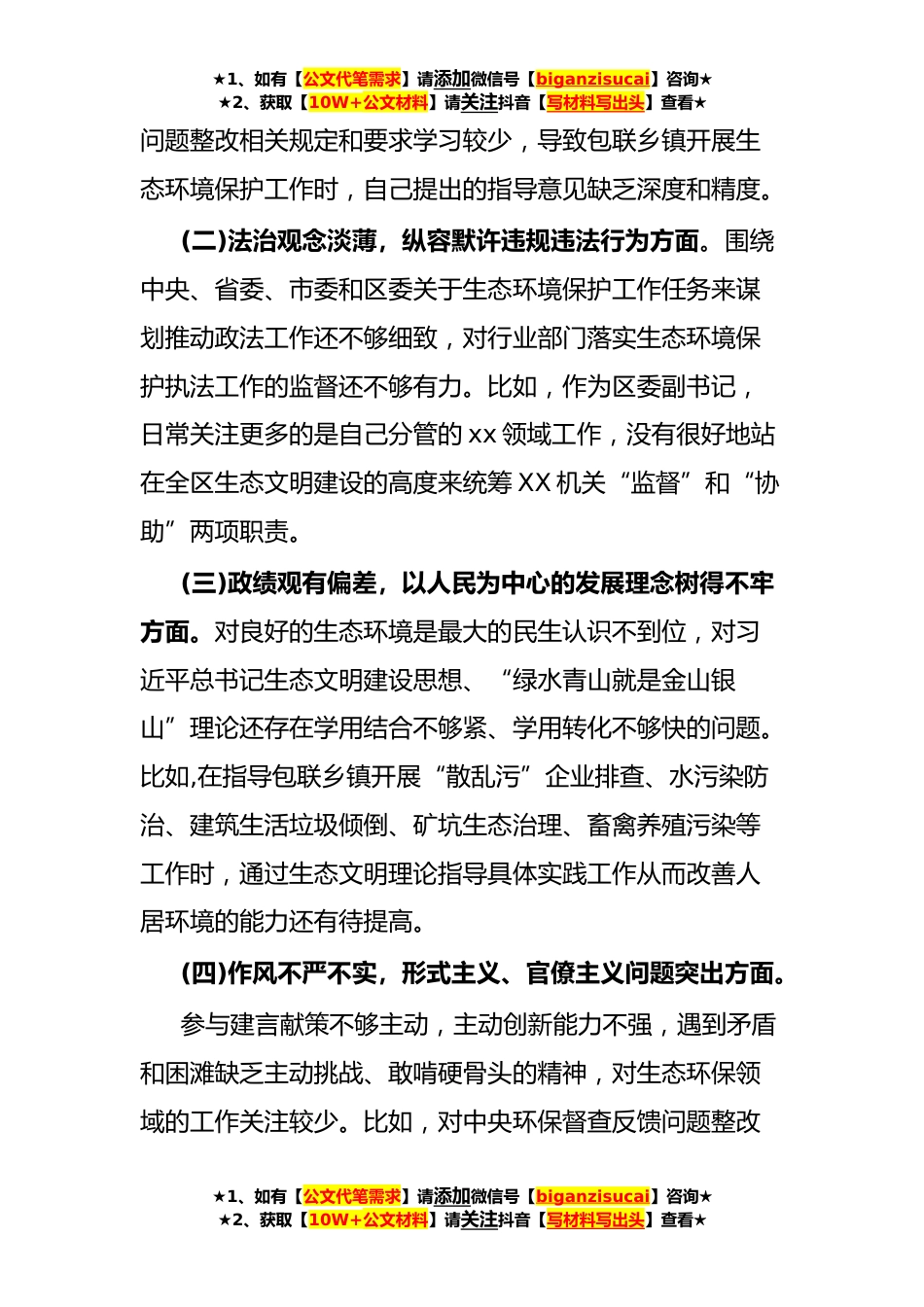 ★1、如有【公文代笔需求】请添加微信号【biganzisucai】咨询★★2、获取【10W+公文材料】请关注抖音【写材料写出头】查看★中央生态环保督查责任追究问题以案促改专题民主生活会个人发言提纲根据省委办公厅《关于中央生态环境保护督察办公室移交3个生态环境损害问题追责问责情况通报》文件精神和市委关于落实中央生态环境保护督察反馈意见整改有关要求,按照区委关于中央生态环保督查责任追究问题以案促改专题民主生活会方案安排,我紧扣会议主题,在深入学习习近平总书记生态文明重要论述和党的Xx大报告中关于生态文明建设相关内容的基础上,紧密结合个人思想工作实际,对照“政治站位不高、政绩观错位、监管不力、工作作风不实”四个重点方面,广泛征求意见、深入谈心谈话,坚持把自己摆进去、把职责摆进去、把...