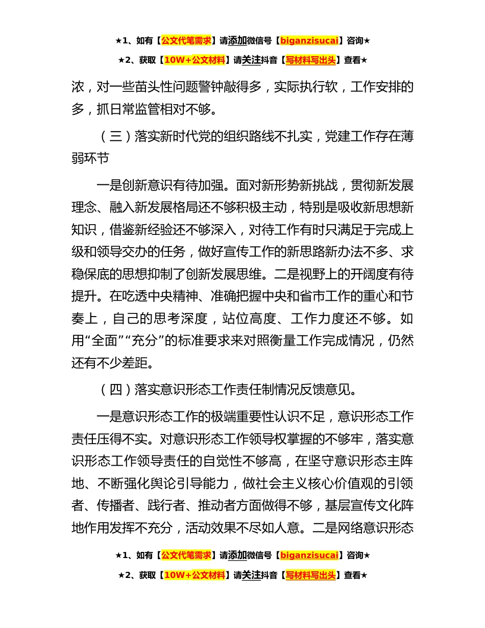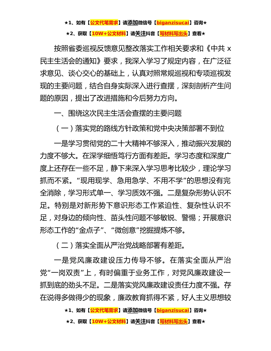 ★1、如有【公文代笔需求】请添加微信号【biganzisucai】咨询★★2、获取【10W+公文材料】请关注抖音【写材料写出头】查看★按照省委巡视反馈意见整改落实工作相关要求和《中共x民主生活会的通知》要求,我深入学习了规定内容,在广泛征求意见、谈心交心的基础上,认真对照常规巡视和专项巡视发现的主要问题,结合自身实际深入进行查摆,深刻剖析产生问题的原因,提出了改进措施和今后努力方向。一、围绕这次民主生活会查摆的主要问题(一)落实党的路线方针政策和党中央决策部署不到位一是学习贯彻党的二十大精神不够深入,推动振兴发展的力度不够大。在深学细悟笃行方面有差距。学习态度和深度广度上还存在一些不足,静下来深入学习思考比较少,理论学习“”抓而不紧。现用现学、急用急学、不用不学的思想没有完...