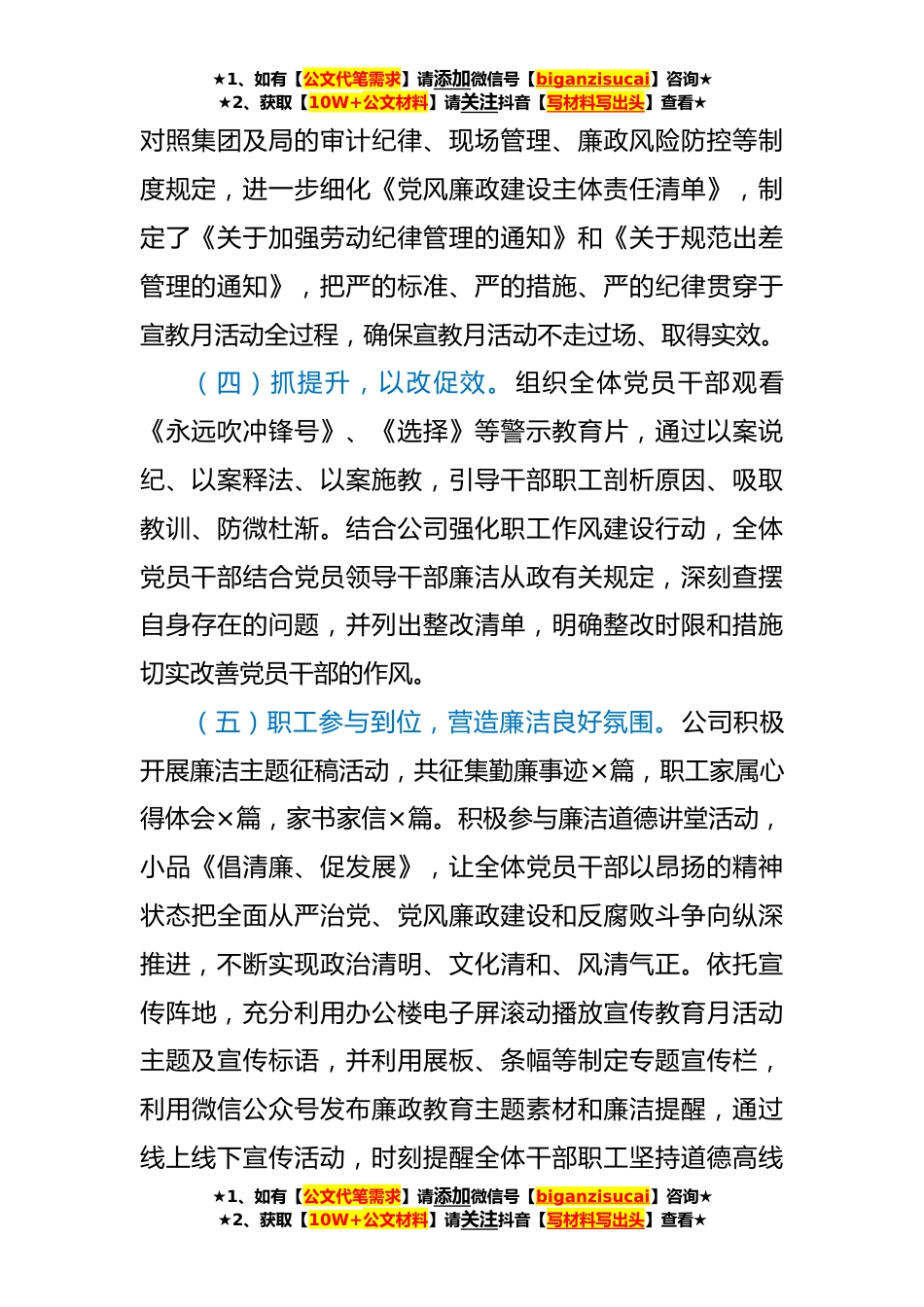 ★1、如有【公文代笔需求】请添加微信号【biganzisucai】咨询★★2、获取【10W+公文材料】请关注抖音【写材料写出头】查看★党风廉政宣教月活动总结自党风廉政建设宣教月活动启动以来,公司结合工作实际,认真谋划组织,周密安排部署,多举措力促党风廉政建设宣教月活动有特色出成效,主要活动总结如下:(一)抓学习,以学促知。公司成立宣教月活动领导小组,制订活动方案,列出活动内容清单,压实责任落实要求。利用党委中心组学习会、党员大会对宣教月活动具体安排部署,开展党风廉政专题学习教育,通过个人自学集中研学等方式,增强党员干部践行“两个维护”的思想和行动自觉,营造公司上下积极宣传学习党纪党规、法律法规的良好氛围。(二)抓载体,以做促行。将宣教月活动与反腐败教育等活动相结合,相继开...