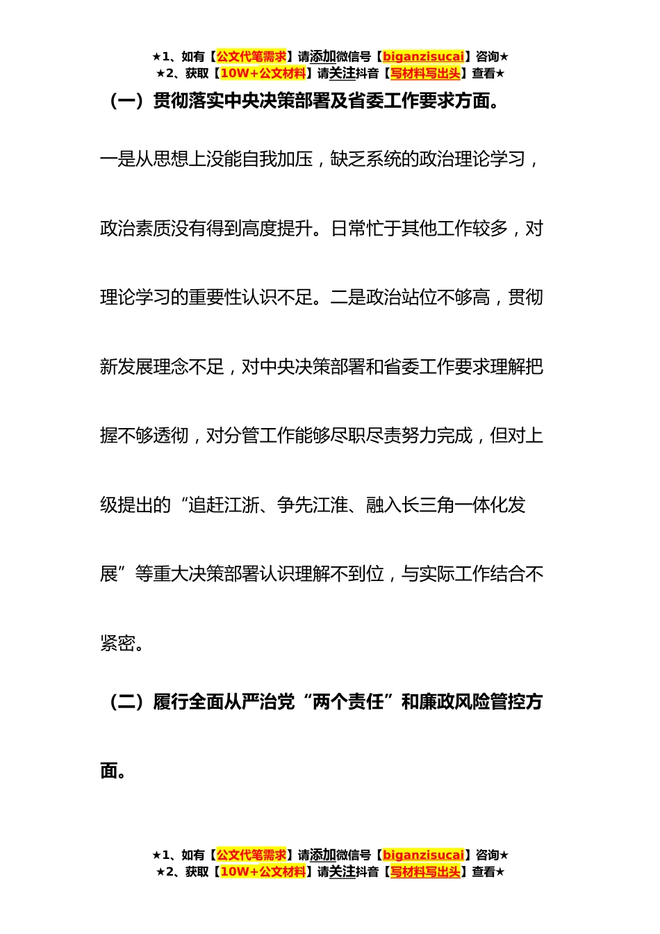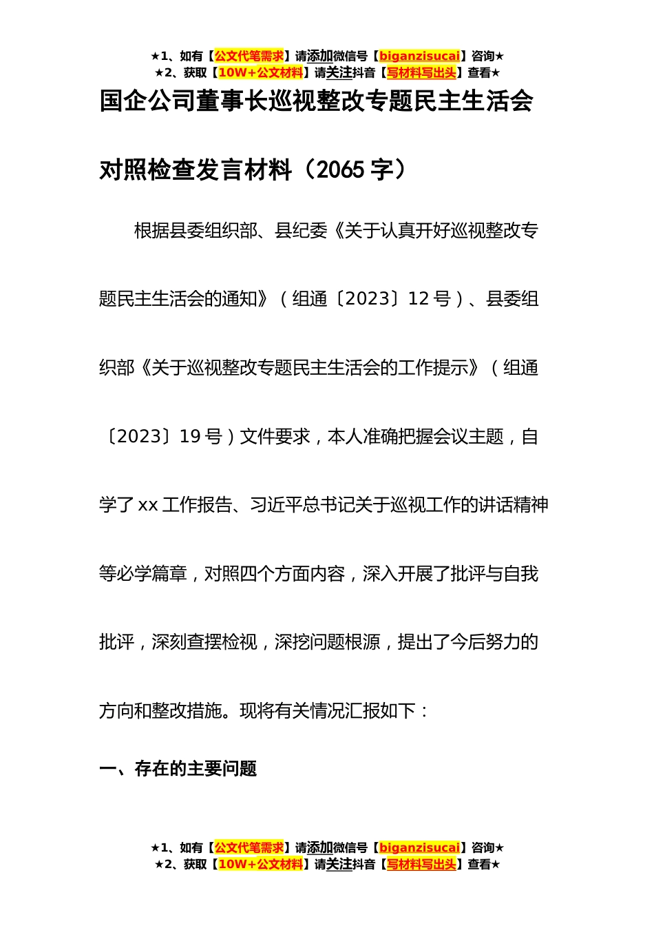 ★1、如有【公文代笔需求】请添加微信号【biganzisucai】咨询★★2、获取【10W+公文材料】请关注抖音【写材料写出头】查看★国企公司董事长巡视整改专题民主生活会对照检查发言材料(2065字)根据县委组织部、县纪委《关于认真开好巡视整改专题民主生活会的通知》(组通〔2023〕12号)、县委组织部《关于巡视整改专题民主生活会的工作提示》(组通〔2023〕19号)文件要求,本人准确把握会议主题,自学了xx工作报告、习近平总书记关于巡视工作的讲话精神等必学篇章,对照四个方面内容,深入开展了批评与自我批评,深刻查摆检视,深挖问题根源,提出了今后努力的方向和整改措施。现将有关情况汇报如下:一、存在的主要问题★1、如有【公文代笔需求】请添加微信号【biganzisucai】咨询★★2、获取【10W+公文材料】请...