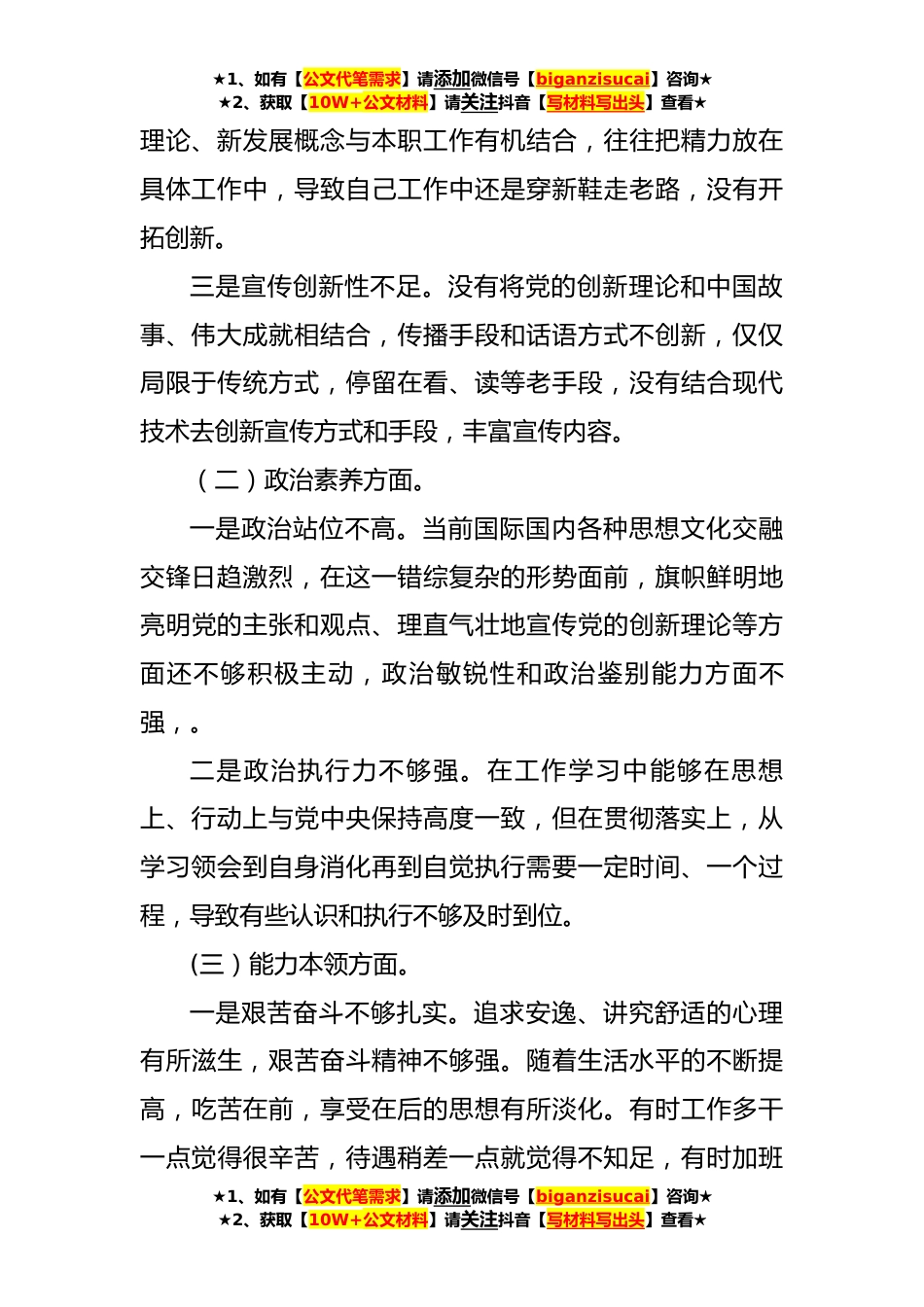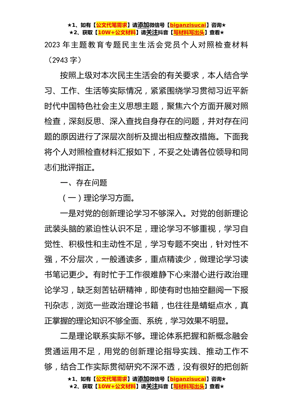 ★1、如有【公文代笔需求】请添加微信号【biganzisucai】咨询★★2、获取【10W+公文材料】请关注抖音【写材料写出头】查看★2023年主题教育专题民主生活会党员个人对照检查材料(2943字)按照上级对本次民主生活会的有关要求,本人结合学习、工作、生活等实际情况,紧紧围绕学习贯彻习近平新时代中国特色社会主义思想主题,聚焦六个方面开展对照检查,深刻反思、深入查找自身存在的问题,并对存在问题的原因进行了深层次剖析及提出相应整改措施。下面我将个人对照检查材料汇报如下,不妥之处请各位领导和同志们批评指正。一、存在问题(一)理论学习方面。一是对党的创新理论学习不够深入。对党的创新理论武装头脑的紧迫性认识不足,理论学习不够重视,学习自觉性、积极性和主动性不足,学习专题不突出,针对性不...