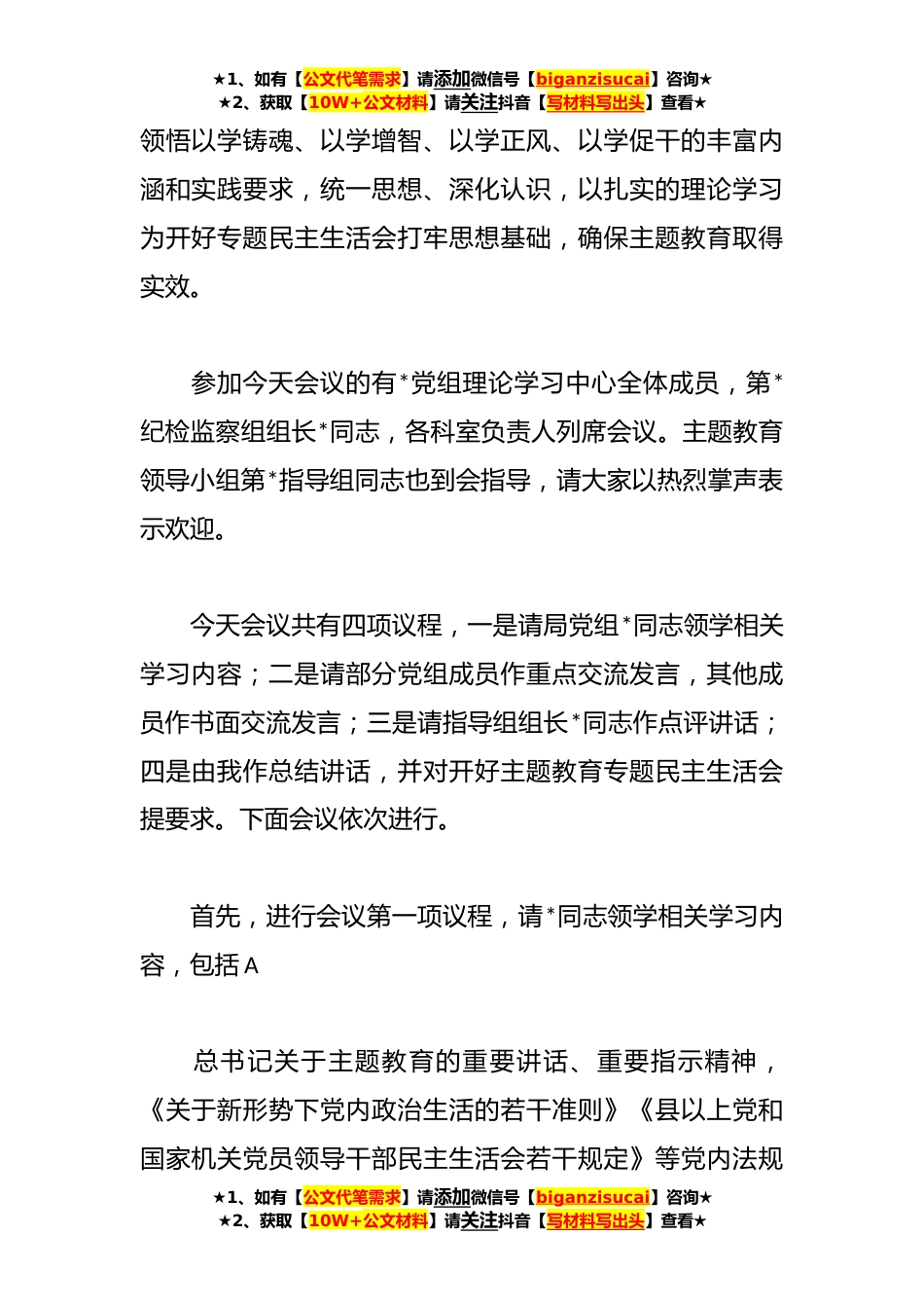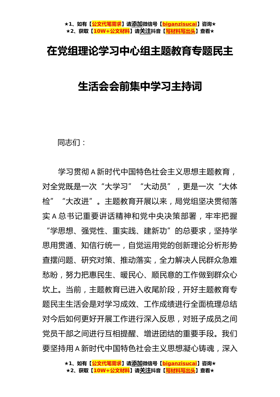 ★1、如有【公文代笔需求】请添加微信号【biganzisucai】咨询★★2、获取【10W+公文材料】请关注抖音【写材料写出头】查看★在党组理论学习中心组主题教育专题民主生活会会前集中学习主持词同志们:学习贯彻A新时代中国特色社会主义思想主题教育,对全党既是一次“大学习”“大动员”,更是一次“大体检”“大改进”。主题教育开展以来,局党组坚决贯彻落实A总书记重要讲话精神和党中央决策部署,牢牢把握“学思想、强党性、重实践、建新功”的总要求,坚持学思用贯通、知信行统一,自觉运用党的创新理论分析形势查摆问题、研究对策、推动落实,全力解决人民群众急难愁盼,努力把惠民生、暖民心、顺民意的工作做到群众心坎上。当前,主题教育已进入收尾阶段,开好主题教育专题民主生活会是对学习成效、工作成绩进...