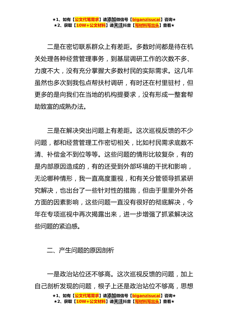 ★1、如有【公文代笔需求】请添加微信号【biganzisucai】咨询★★2、获取【10W+公文材料】请关注抖音【写材料写出头】查看★关于包村帮扶领导巡视整改民主生活会发言材料根据巡视办要求,按照集团公司党委巡视整改专题民主生活会的安排,我认真对照巡视组反馈的整改意见,紧扣这次民主生活会主题,结合自身思想和工作实际,认真查摆问题,深刻剖析原因,明确整改措施。现将有关情况报告如下。一、查摆发现的问题一是在强化理论武装上有差距。主要是对A新时代中国特色社会主义思想学习的还不够,没有真正做到融会贯通学、结合实际学,尤其是在学习领会A总书记关于乡村振兴工作的重要论述方面,大多是平时学习上级来文、参加有关会议或者按部就班地参加集体学习,理解的不够深刻,把握的不够全面,没有在强化理论武...