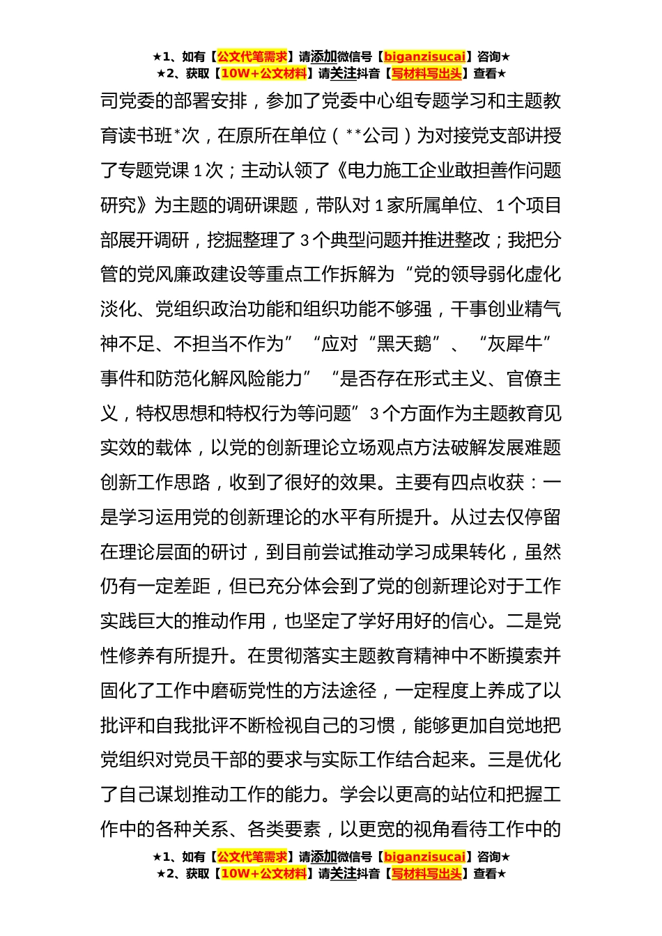 ★1、如有【公文代笔需求】请添加微信号【biganzisucai】咨询★★2、获取【10W+公文材料】请关注抖音【写材料写出头】查看★副总经理2023年主题教育民主生活会个人发言提纲根据《公司党委学习贯彻习近平新时代中国特色社会主义思想主题教育专题民主生活会方案》通知要求,近期我深入学习党的二十大精神,系统学习习近平新时代中国特色社会主义思想,并积极参加中心组学习,紧密结合工作实际,通过征求意见、谈心交流和个人自查,对照文件明确的理论学习、政治素质、能力本领、担当作为、工作作风廉洁自律等六个方面和习近平总书记提出的“十二个方面”的具体要求,深入查摆自身存在的差距和不足,深刻剖析根源,认真制定整改措施,明确了下步努力方向。现将本人对照检查情况汇报如下:一、参加主题教育的收获和体...