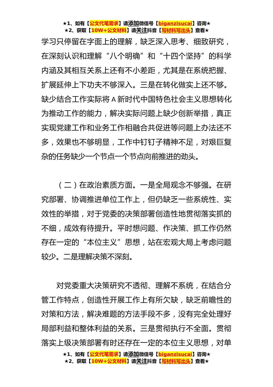 ★1、如有【公文代笔需求】请添加微信号【biganzisucai】咨询★★2、获取【10W+公文材料】请关注抖音【写材料写出头】查看★2023年专题民主生活会领导干部个人六个方面对照检查材料按照*专题民主生活会的部署要求,我紧扣学习贯彻A新时代中国特色社会主义思想这一主题,严格对照六个方面,认真检视问题,深刻剖析原因,明确整改措施与努力方向。现将个人检视剖析情况报告如下:一、存在的主要问题(一)在理论学习方面。一是在系统学习上还不够。学习的计划性、系统性、持续性还有欠缺,没有整体学习计划,平时集中学习上抓得比较紧,但过于依赖集中学习个人自学抓得不够、开展不经常,多数时候是上级要求学什么就学什么,那些方面与自身工作结合紧密就学习那些方面,对照“往深里走、往心里走、往实里走”还有差...