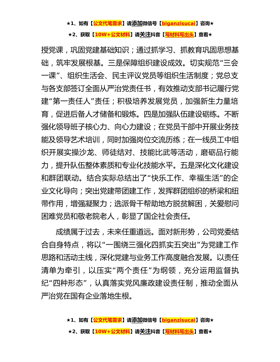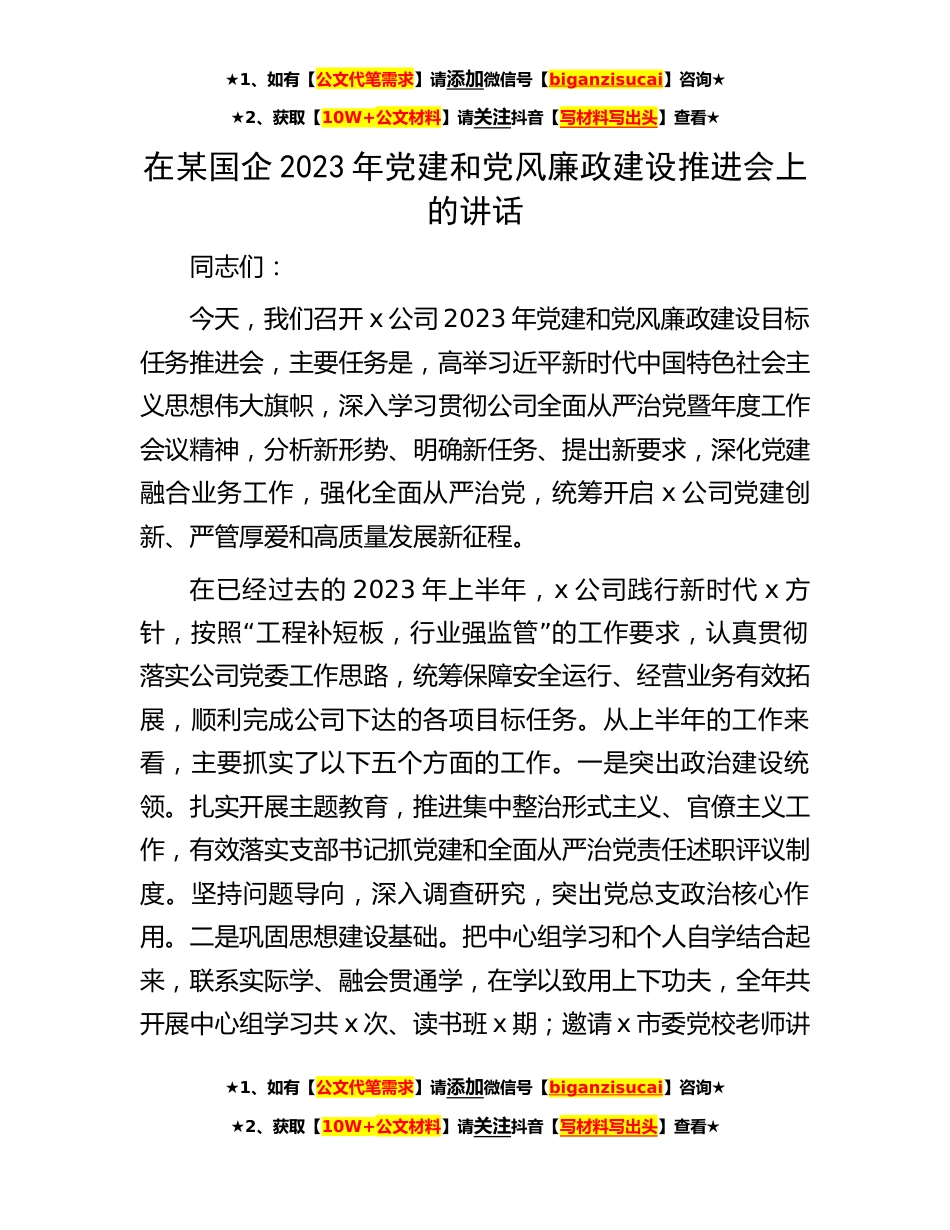 ★1、如有【公文代笔需求】请添加微信号【biganzisucai】咨询★★2、获取【10W+公文材料】请关注抖音【写材料写出头】查看★在某国企2023年党建和党风廉政建设推进会上的讲话同志们:今天,我们召开x公司2023年党建和党风廉政建设目标任务推进会,主要任务是,高举习近平新时代中国特色社会主义思想伟大旗帜,深入学习贯彻公司全面从严治党暨年度工作会议精神,分析新形势、明确新任务、提出新要求,深化党建融合业务工作,强化全面从严治党,统筹开启x公司党建创新、严管厚爱和高质量发展新征程。在已经过去的2023年上半年,x公司践行新时代x方“”针,按照工程补短板,行业强监管的工作要求,认真贯彻落实公司党委工作思路,统筹保障安全运行、经营业务有效拓展,顺利完成公司下达的各项目标任务。从上半年的工...