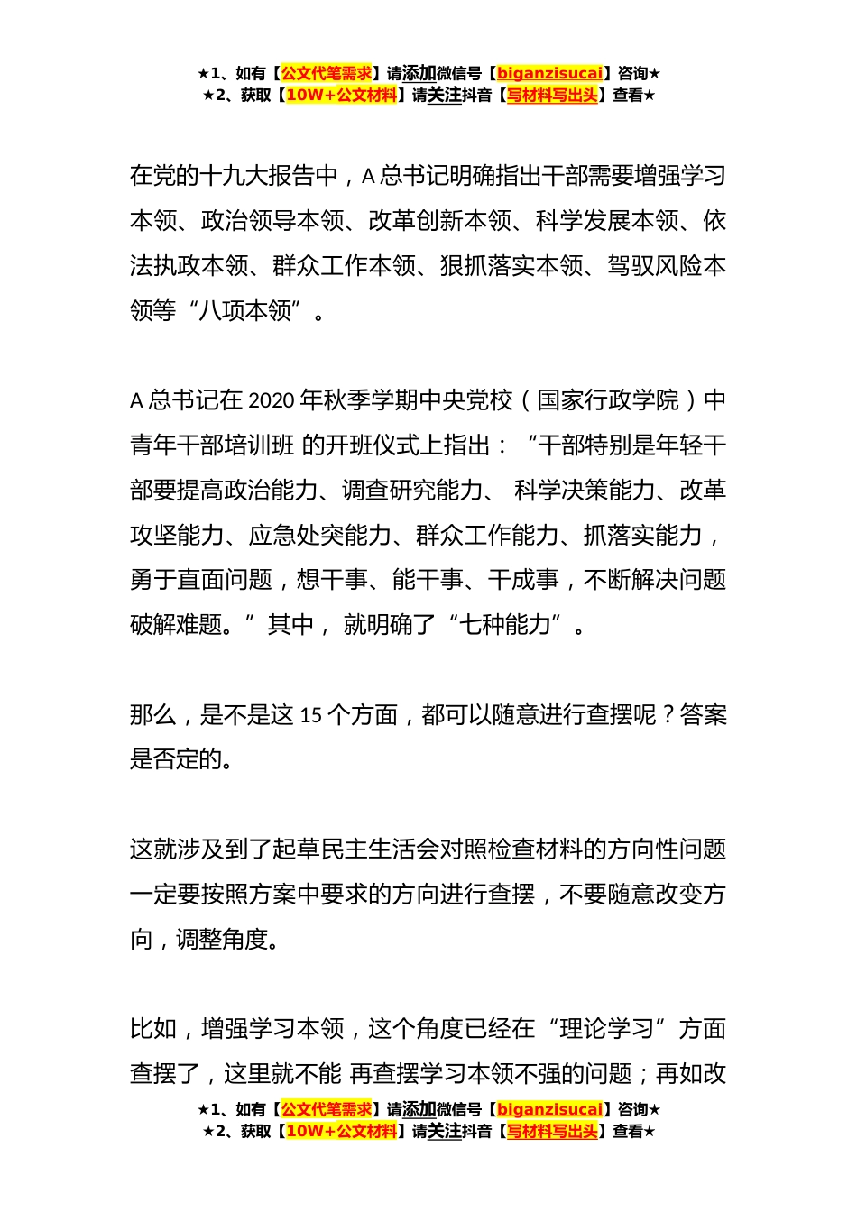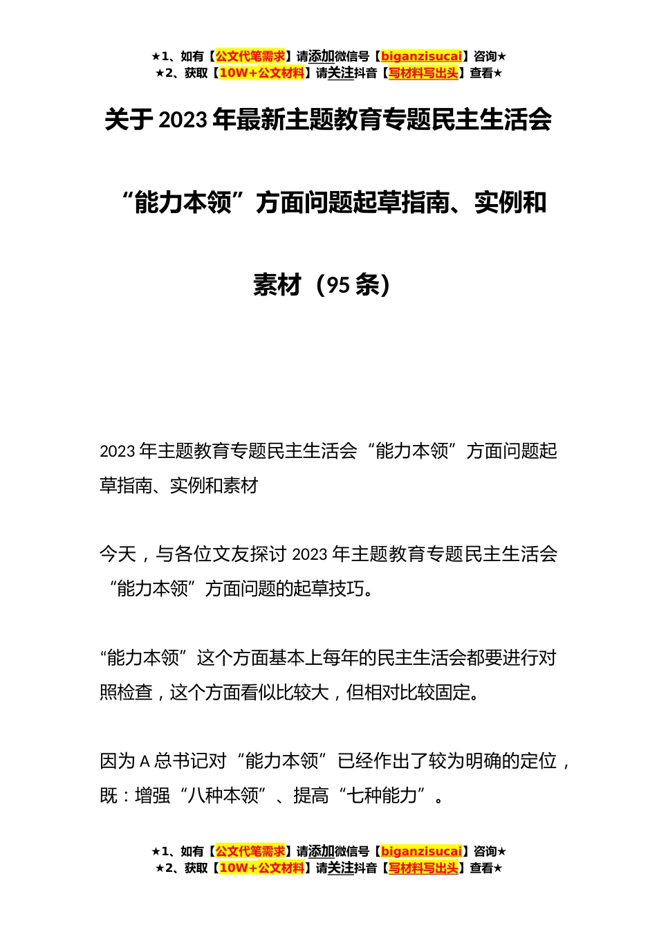 ★1、如有【公文代笔需求】请添加微信号【biganzisucai】咨询★★2、获取【10W+公文材料】请关注抖音【写材料写出头】查看★关于2023年最新主题教育专题民主生活会“能力本领”方面问题起草指南、实例和素材(95条)2023年主题教育专题民主生活会“能力本领”方面问题起草指南、实例和素材今天,与各位文友探讨2023年主题教育专题民主生活会“能力本领”方面问题的起草技巧。“能力本领”这个方面基本上每年的民主生活会都要进行对照检查,这个方面看似比较大,但相对比较固定。因为A总书记对“能力本领”已经作出了较为明确的定位,既:增强“八种本领”、提高“七种能力”。★1、如有【公文代笔需求】请添加微信号【biganzisucai】咨询★★2、获取【10W+公文材料】请关注抖音【写材料写出头】查看★★1、如有【...