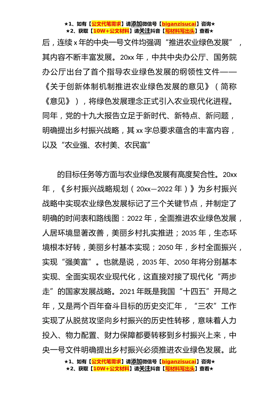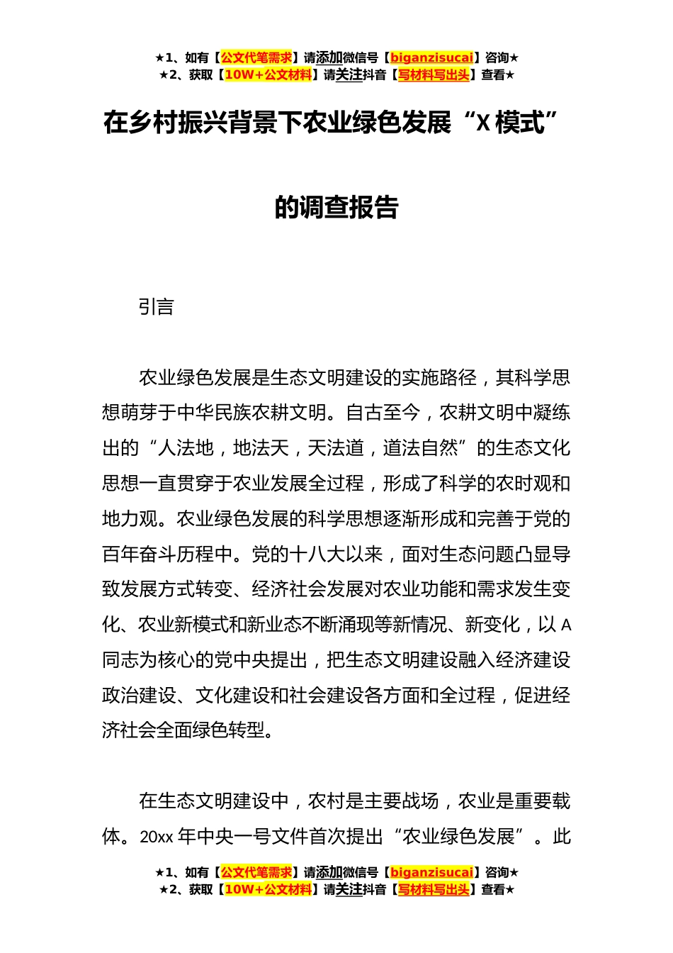 ★1、如有【公文代笔需求】请添加微信号【biganzisucai】咨询★★2、获取【10W+公文材料】请关注抖音【写材料写出头】查看★在乡村振兴背景下农业绿色发展“X模式”的调查报告引言农业绿色发展是生态文明建设的实施路径,其科学思想萌芽于中华民族农耕文明。自古至今,农耕文明中凝练出的“人法地,地法天,天法道,道法自然”的生态文化思想一直贯穿于农业发展全过程,形成了科学的农时观和地力观。农业绿色发展的科学思想逐渐形成和完善于党的百年奋斗历程中。党的十八大以来,面对生态问题凸显导致发展方式转变、经济社会发展对农业功能和需求发生变化、农业新模式和新业态不断涌现等新情况、新变化,以A同志为核心的党中央提出,把生态文明建设融入经济建设政治建设、文化建设和社会建设各方面和全过程,促进...
