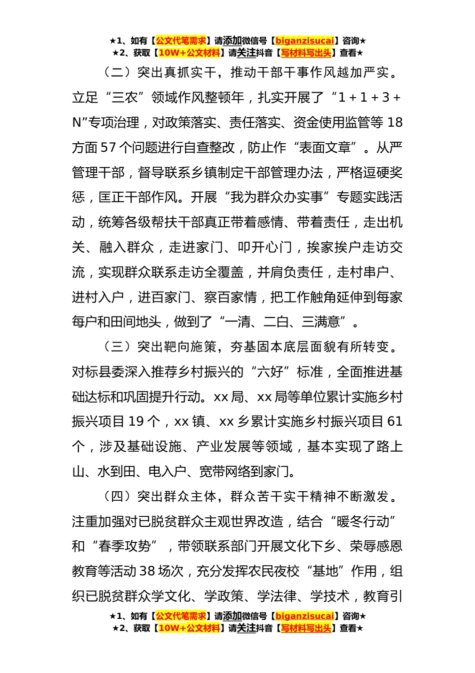 ★1、如有【公文代笔需求】请添加微信号【biganzisucai】咨询★★2、获取【10W+公文材料】请关注抖音【写材料写出头】查看★副县长关于落实乡村振兴阶段性工作总结(1945字)2023年,是全面贯彻落实党的XX大精神的开局之年,是巩固拓展脱贫攻坚成果同乡村振兴有效衔接的关键之年,是我县推动实施乡村振兴战略走在前列的深化之年,我始终聚焦“全面振兴”这一主线,紧扣“三农”工作大局,深入践行三分之二工作法和一线工作法,狠下功夫,强化责任落实、政策落实、工作落实,持续下足“绣花功夫”。现将相关情况总结如下。(一)突出为民意识,督导干部政治担当切实增强。在全面推进乡村振兴这场没有硝烟的战争中,督导联系的xx局、xx的、xx镇及其对口帮扶部门等单位始终把乡村振兴工作作为首要任务和第一民生工程...