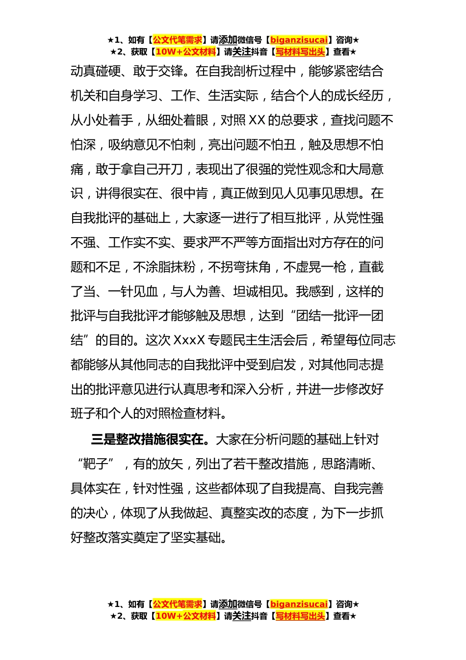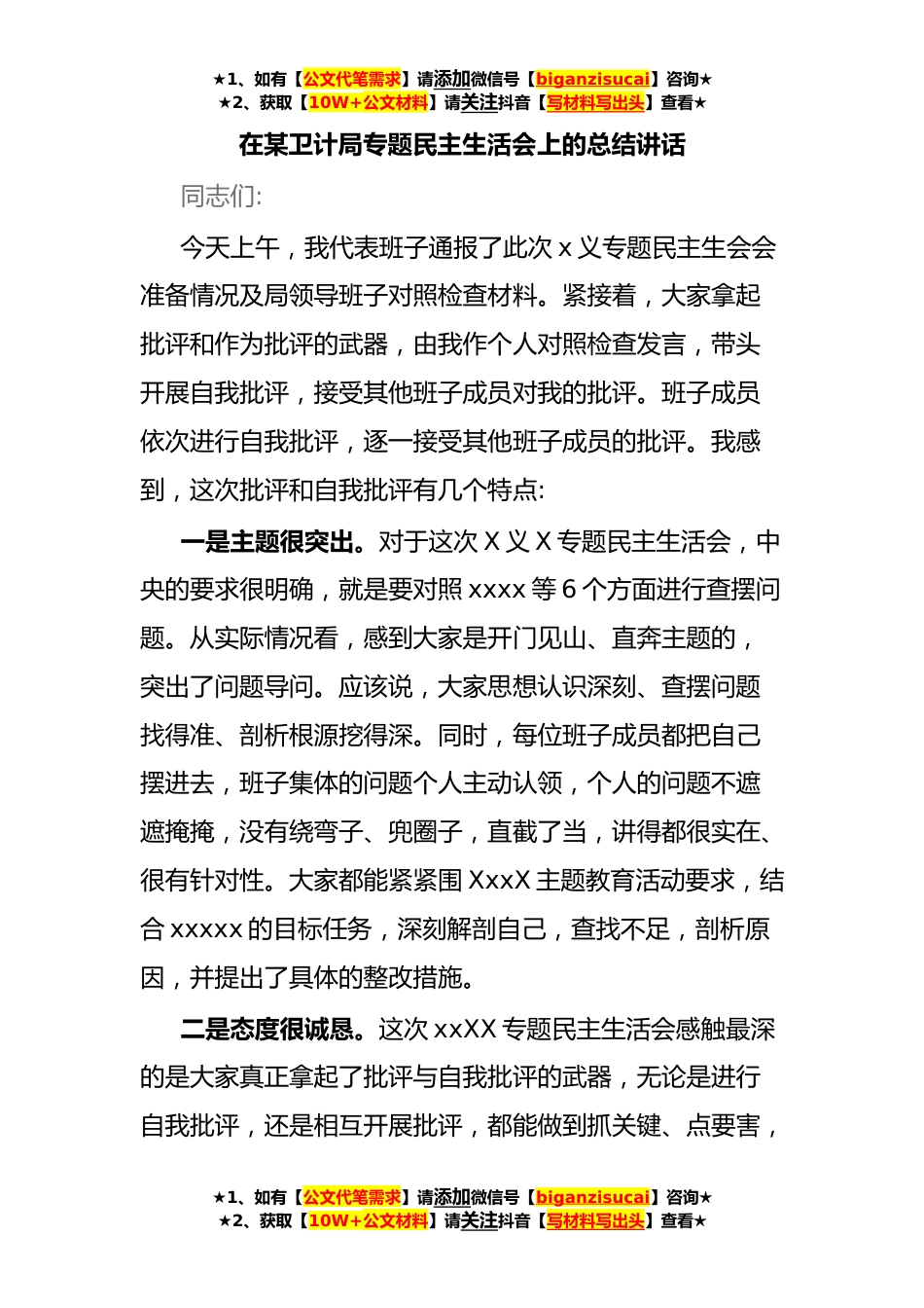 ★1、如有【公文代笔需求】请添加微信号【biganzisucai】咨询★★2、获取【10W+公文材料】请关注抖音【写材料写出头】查看★在某卫计局专题民主生活会上的总结讲话同志们:今天上午,我代表班子通报了此次x义专题民主生会会准备情况及局领导班子对照检查材料。紧接着,大家拿起批评和作为批评的武器,由我作个人对照检查发言,带头开展自我批评,接受其他班子成员对我的批评。班子成员依次进行自我批评,逐一接受其他班子成员的批评。我感到,这次批评和自我批评有几个特点:一是主题很突出。对于这次X义X专题民主生活会,中央的要求很明确,就是要对照xxxx等6个方面进行查摆问题。从实际情况看,感到大家是开门见山、直奔主题的,突出了问题导问。应该说,大家思想认识深刻、查摆问题找得准、剖析根源挖得深。同时...