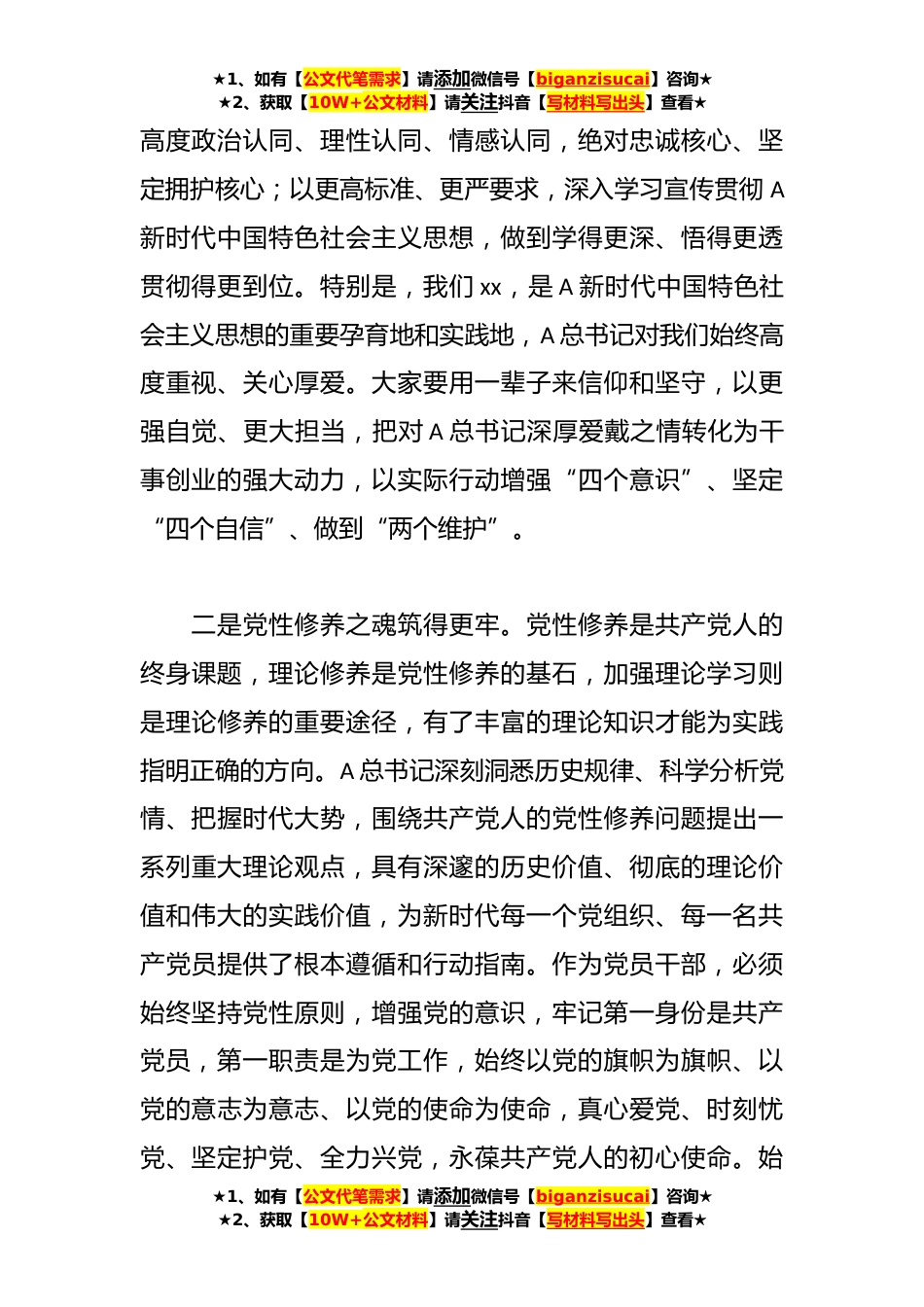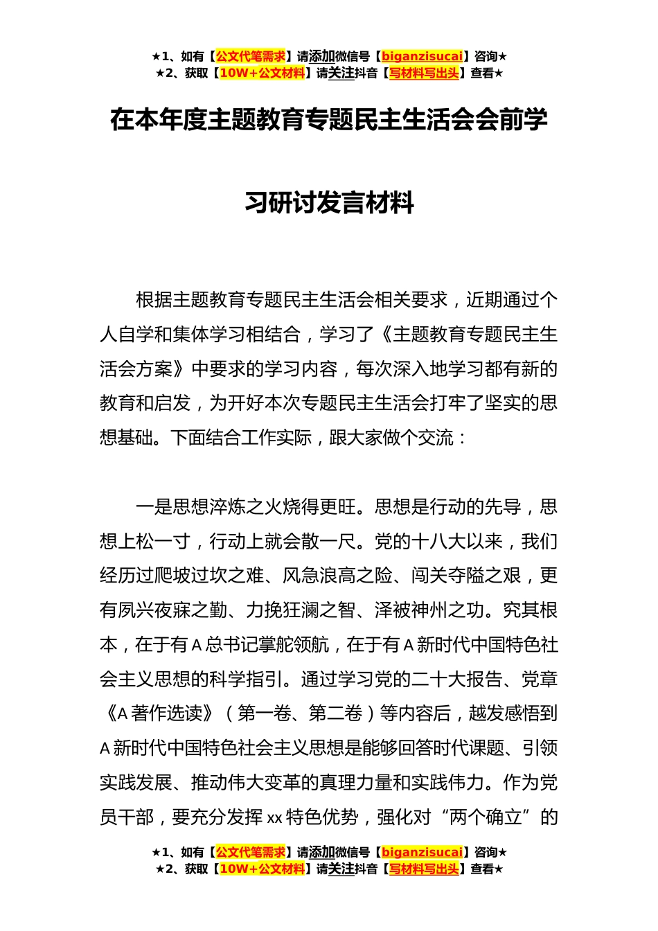 ★1、如有【公文代笔需求】请添加微信号【biganzisucai】咨询★★2、获取【10W+公文材料】请关注抖音【写材料写出头】查看★在本年度主题教育专题民主生活会会前学习研讨发言材料根据主题教育专题民主生活会相关要求,近期通过个人自学和集体学习相结合,学习了《主题教育专题民主生活会方案》中要求的学习内容,每次深入地学习都有新的教育和启发,为开好本次专题民主生活会打牢了坚实的思想基础。下面结合工作实际,跟大家做个交流:一是思想淬炼之火烧得更旺。思想是行动的先导,思想上松一寸,行动上就会散一尺。党的十八大以来,我们经历过爬坡过坎之难、风急浪高之险、闯关夺隘之艰,更有夙兴夜寐之勤、力挽狂澜之智、泽被神州之功。究其根本,在于有A总书记掌舵领航,在于有A新时代中国特色社会主义思想的...