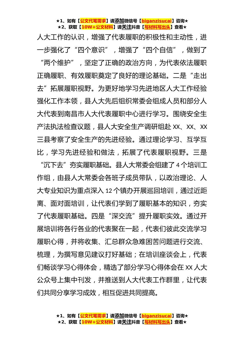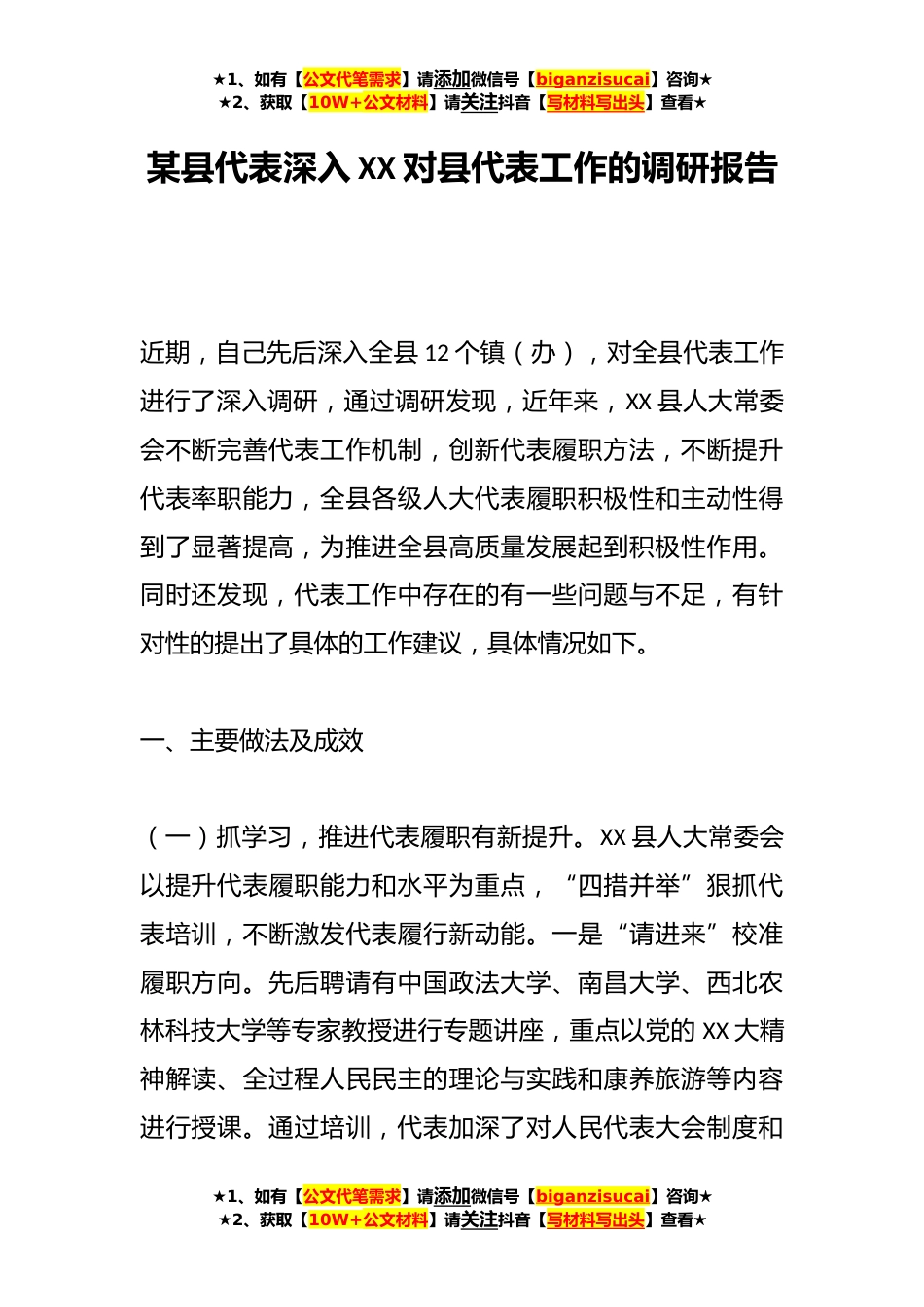★1、如有【公文代笔需求】请添加微信号【biganzisucai】咨询★★2、获取【10W+公文材料】请关注抖音【写材料写出头】查看★某县代表深入XX对县代表工作的调研报告近期,自己先后深入全县12个镇(办),对全县代表工作进行了深入调研,通过调研发现,近年来,XX县人大常委会不断完善代表工作机制,创新代表履职方法,不断提升代表率职能力,全县各级人大代表履职积极性和主动性得到了显著提高,为推进全县高质量发展起到积极性作用。同时还发现,代表工作中存在的有一些问题与不足,有针对性的提出了具体的工作建议,具体情况如下。一、主要做法及成效(一)抓学习,推进代表履职有新提升。XX县人大常委会以提升代表履职能力和水平为重点,“四措并举”狠抓代表培训,不断激发代表履行新动能。一是“请进来”校准...