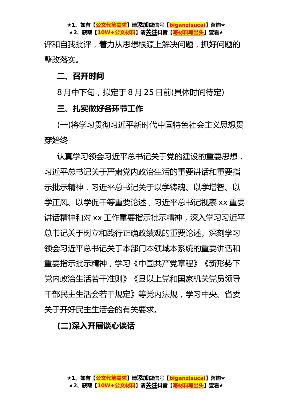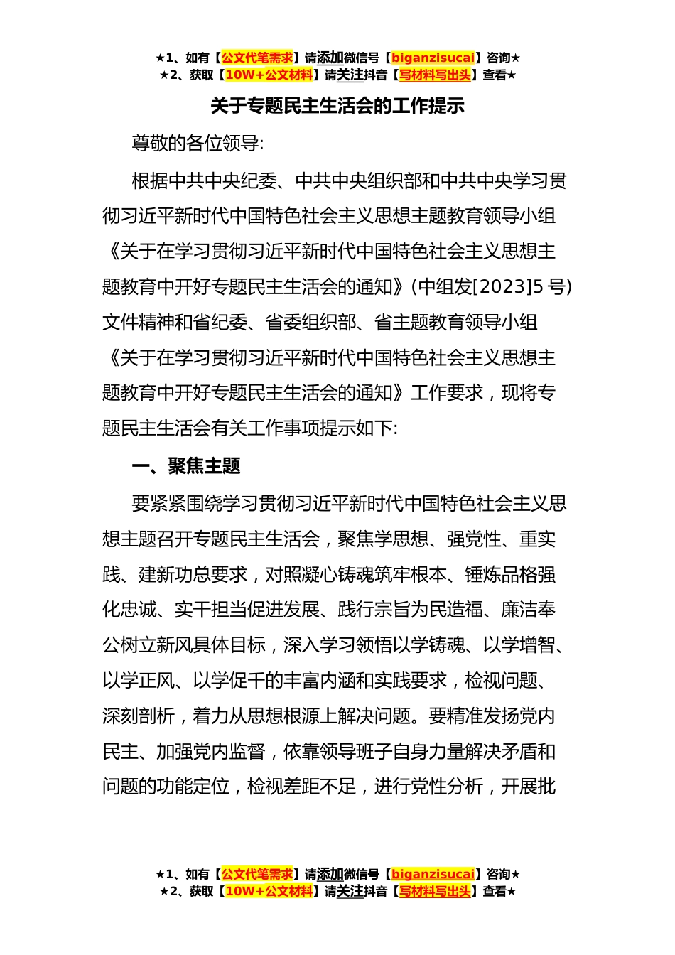★1、如有【公文代笔需求】请添加微信号【biganzisucai】咨询★★2、获取【10W+公文材料】请关注抖音【写材料写出头】查看★关于专题民主生活会的工作提示尊敬的各位领导:根据中共中央纪委、中共中央组织部和中共中央学习贯彻习近平新时代中国特色社会主义思想主题教育领导小组《关于在学习贯彻习近平新时代中国特色社会主义思想主题教育中开好专题民主生活会的通知》(中组发[2023]5号)文件精神和省纪委、省委组织部、省主题教育领导小组《关于在学习贯彻习近平新时代中国特色社会主义思想主题教育中开好专题民主生活会的通知》工作要求,现将专题民主生活会有关工作事项提示如下:一、聚焦主题要紧紧围绕学习贯彻习近平新时代中国特色社会主义思想主题召开专题民主生活会,聚焦学思想、强党性、重实践、建新功总要...