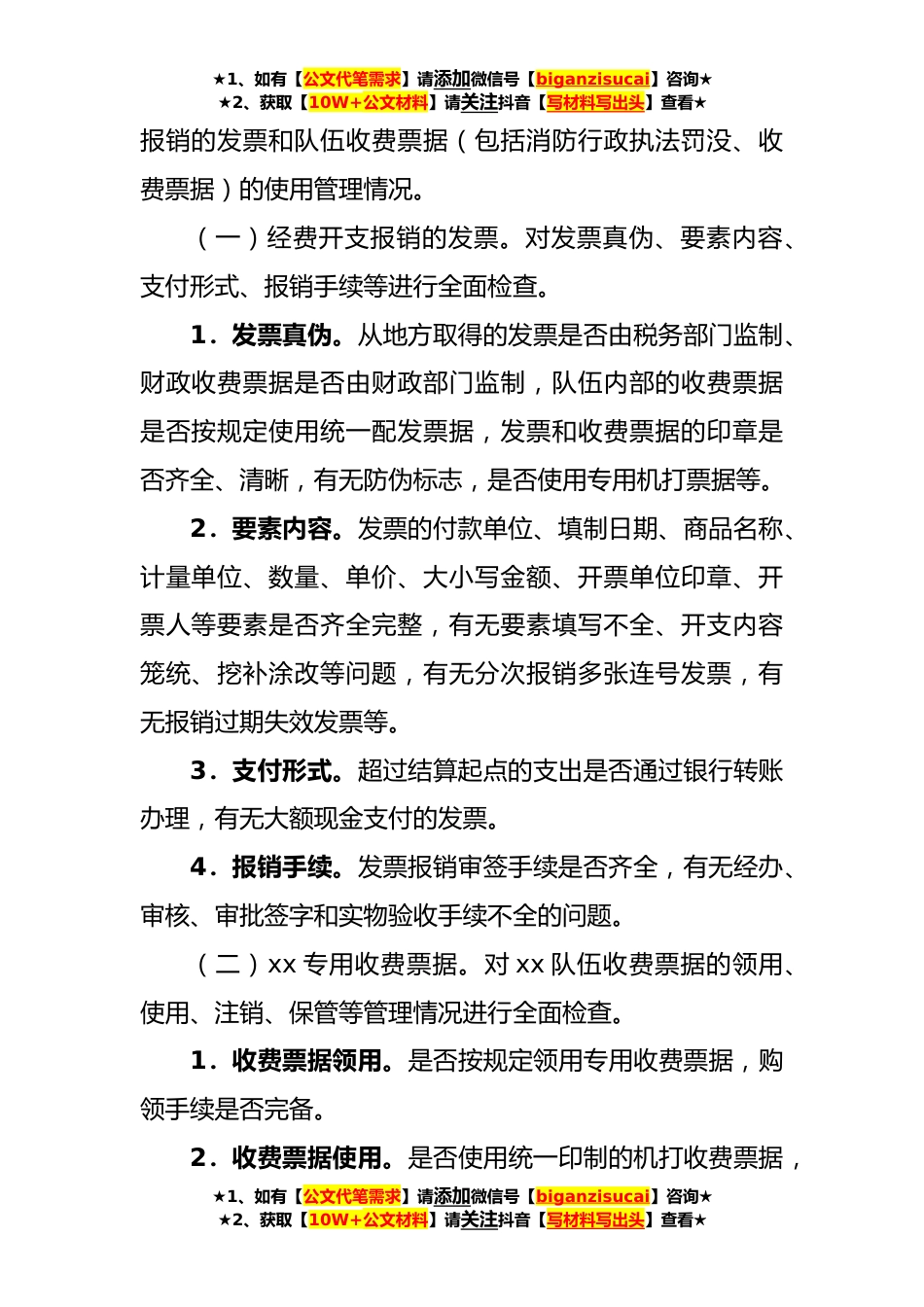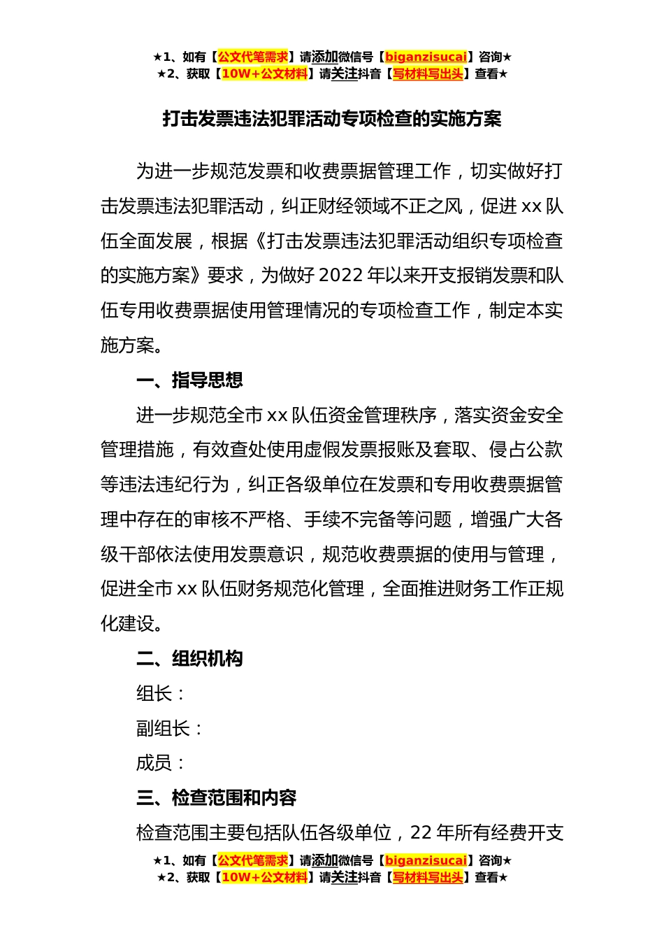 ★1、如有【公文代笔需求】请添加微信号【biganzisucai】咨询★★2、获取【10W+公文材料】请关注抖音【写材料写出头】查看★打击发票违法犯罪活动专项检查的实施方案为进一步规范发票和收费票据管理工作,切实做好打击发票违法犯罪活动,纠正财经领域不正之风,促进xx队伍全面发展,根据《打击发票违法犯罪活动组织专项检查的实施方案》要求,为做好2022年以来开支报销发票和队伍专用收费票据使用管理情况的专项检查工作,制定本实施方案。一、指导思想进一步规范全市xx队伍资金管理秩序,落实资金安全管理措施,有效查处使用虚假发票报账及套取、侵占公款等违法违纪行为,纠正各级单位在发票和专用收费票据管理中存在的审核不严格、手续不完备等问题,增强广大各级干部依法使用发票意识,规范收费票据的使用与管...