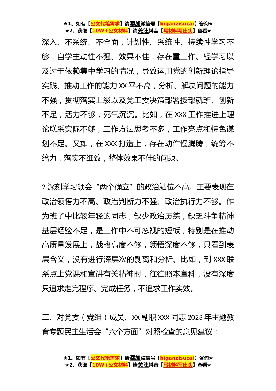 ★1、如有【公文代笔需求】请添加微信号【biganzisucai】咨询★★2、获取【10W+公文材料】请关注抖音【写材料写出头】查看★领导干部在2023年主题教育专题民主生活会上对其他班子成员的批评意见同志们:刚才认真听了大家围绕理论学习、政治素质、能力本领、担当作为、工作作风、廉洁自律等“六个方面”深的个人对照检查发言。结合日常工作实际,为要达到凝心铸魂筑牢根本、锤炼品格强化忠诚、实干担当促进发展、践行宗旨为民造福、廉洁奉公树立新风的目标,按照“批评—团结—批评”的方针,对XX党委(党组)班子成员的同志逐一提出如下批评意见。供大家进一步对照检查参考。一、对党委(党组)副书记、XX局长(主任)XXX同志2023年主题教育专题民主生活会“六个方面”对照检查的意见建议:1.对新思想新战略新论断...
