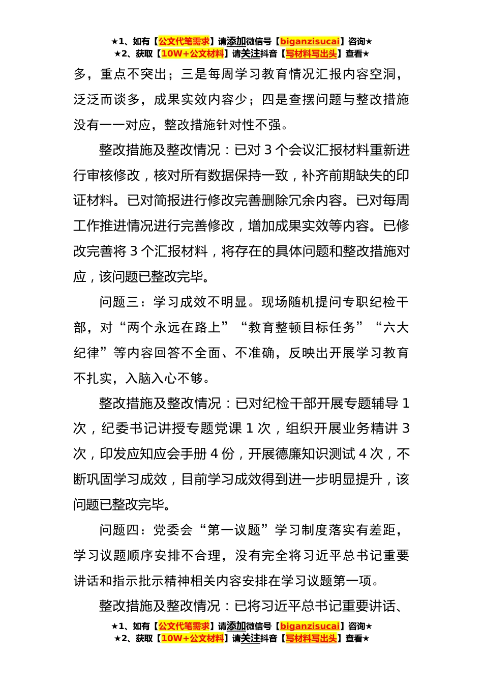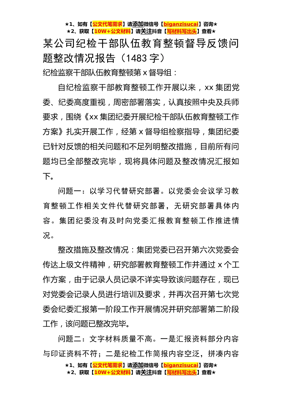★1、如有【公文代笔需求】请添加微信号【biganzisucai】咨询★★2、获取【10W+公文材料】请关注抖音【写材料写出头】查看★某公司纪检干部队伍教育整顿督导反馈问题整改情况报告(1483字)纪检监察干部队伍教育整顿第x督导组:自纪检监察干部教育整顿工作开展以来,xx集团党委、纪委高度重视,周密部署落实,认真按照中央及兵师要求,围绕《xx集团纪委开展纪检干部队伍教育整顿工作方案》扎实开展工作,经第x督导组检察指导,集团纪委已针对反馈的相关问题和不足列明整改措施,目前所有问题均已全部整改完毕,现将具体问题及整改情况汇报如下。问题一:以学习代替研究部署。以党委会会议学习教育整顿工作相关文件代替研究部署,无研究部署具体内容。集团纪委没有及时向党委汇报教育整顿工作推进情况。整改措施及...