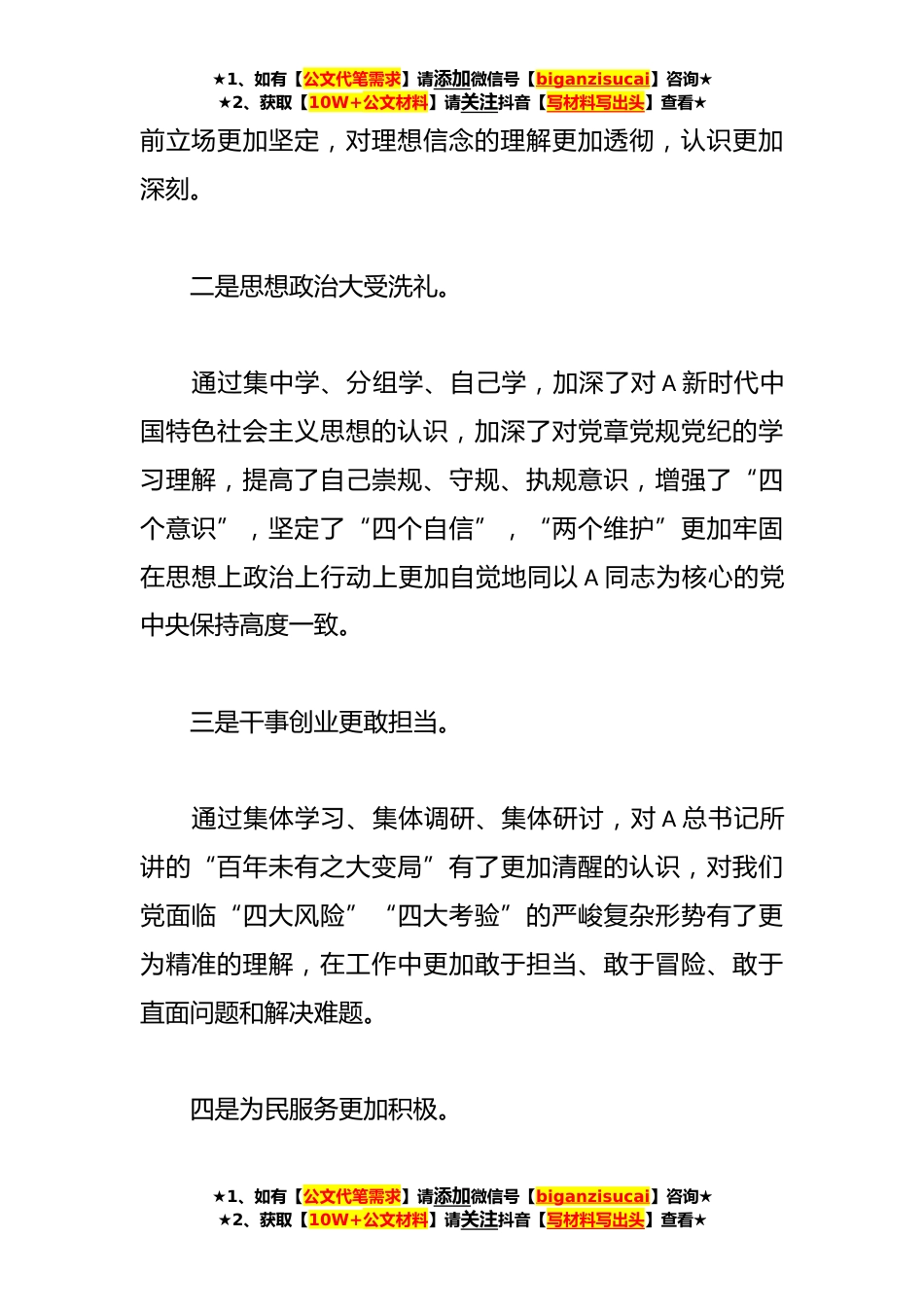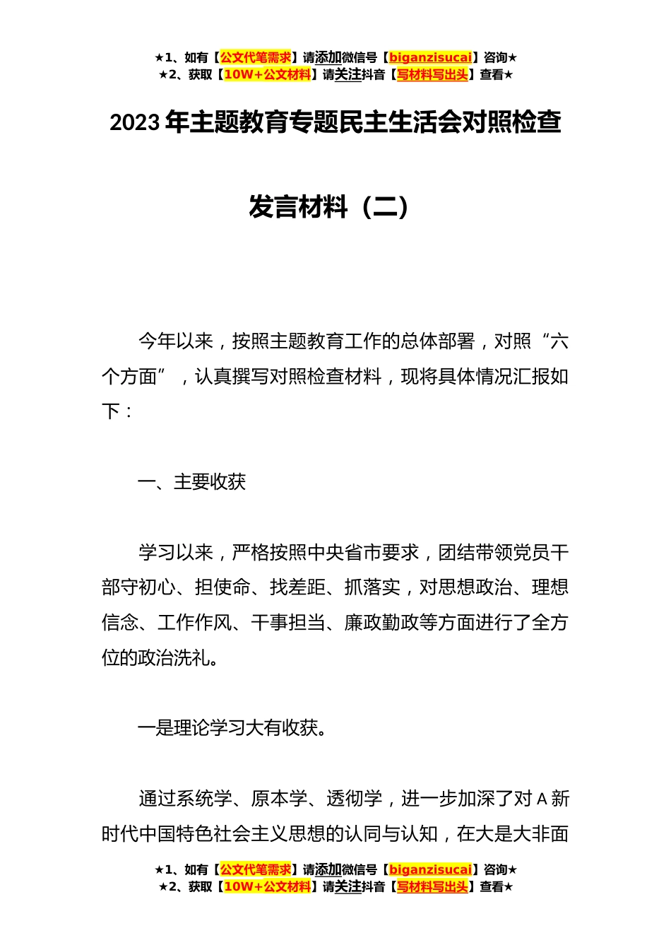 ★1、如有【公文代笔需求】请添加微信号【biganzisucai】咨询★★2、获取【10W+公文材料】请关注抖音【写材料写出头】查看★2023年主题教育专题民主生活会对照检查发言材料(二)今年以来,按照主题教育工作的总体部署,对照“六个方面”,认真撰写对照检查材料,现将具体情况汇报如下:一、主要收获学习以来,严格按照中央省市要求,团结带领党员干部守初心、担使命、找差距、抓落实,对思想政治、理想信念、工作作风、干事担当、廉政勤政等方面进行了全方位的政治洗礼。一是理论学习大有收获。通过系统学、原本学、透彻学,进一步加深了对A新时代中国特色社会主义思想的认同与认知,在大是大非面★1、如有【公文代笔需求】请添加微信号【biganzisucai】咨询★★2、获取【10W+公文材料】请关注抖音【写材料写出头...