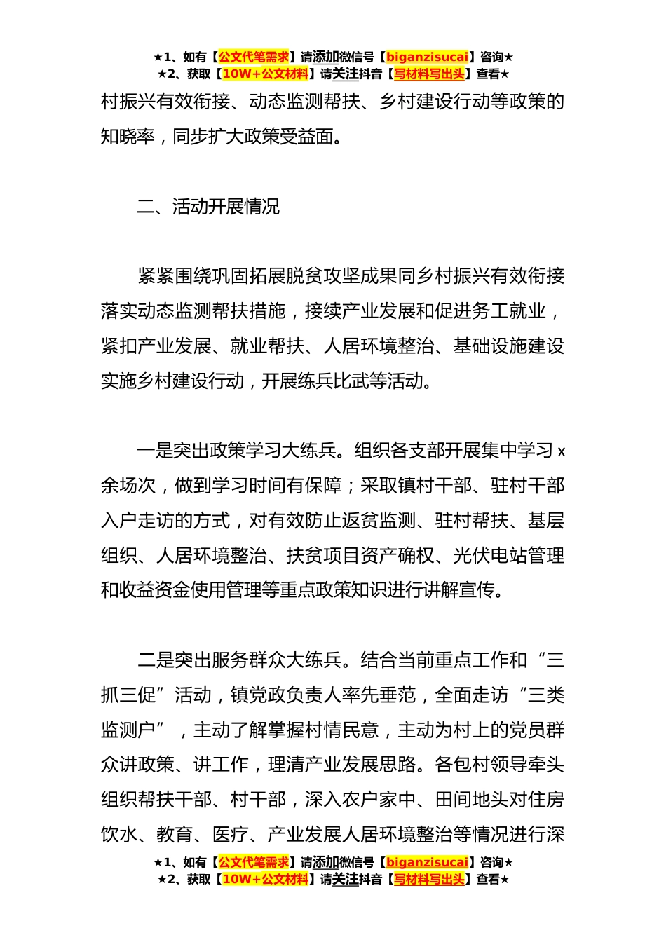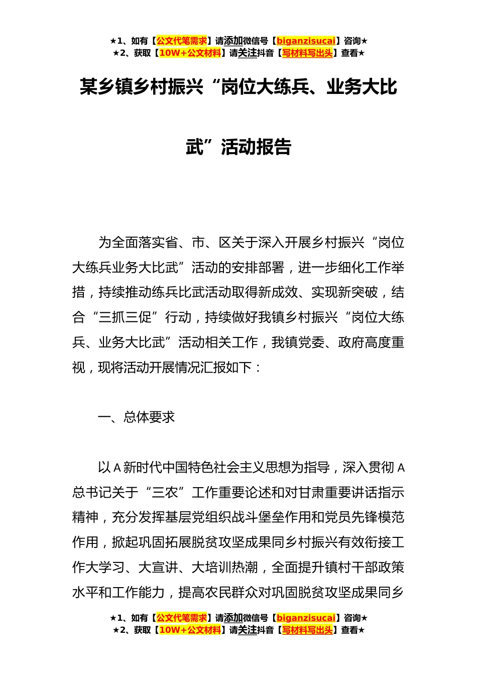 ★1、如有【公文代笔需求】请添加微信号【biganzisucai】咨询★★2、获取【10W+公文材料】请关注抖音【写材料写出头】查看★某乡镇乡村振兴“岗位大练兵、业务大比武”活动报告为全面落实省、市、区关于深入开展乡村振兴“岗位大练兵业务大比武”活动的安排部署,进一步细化工作举措,持续推动练兵比武活动取得新成效、实现新突破,结合“三抓三促”行动,持续做好我镇乡村振兴“岗位大练兵、业务大比武”活动相关工作,我镇党委、政府高度重视,现将活动开展情况汇报如下:一、总体要求以A新时代中国特色社会主义思想为指导,深入贯彻A总书记关于“三农”工作重要论述和对甘肃重要讲话指示精神,充分发挥基层党组织战斗堡垒作用和党员先锋模范作用,掀起巩固拓展脱贫攻坚成果同乡村振兴有效衔接工作大学习、大宣...
