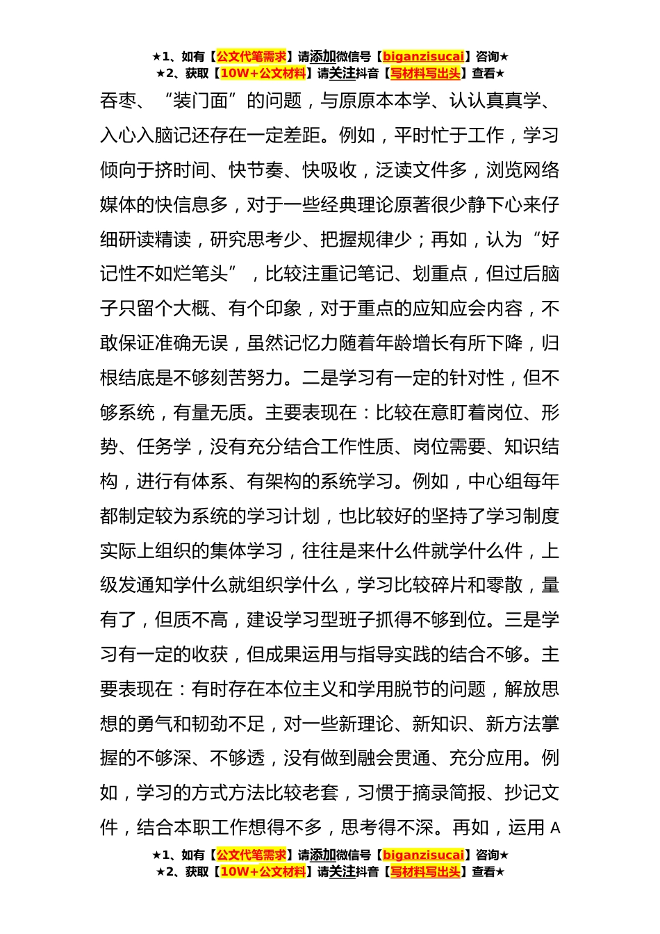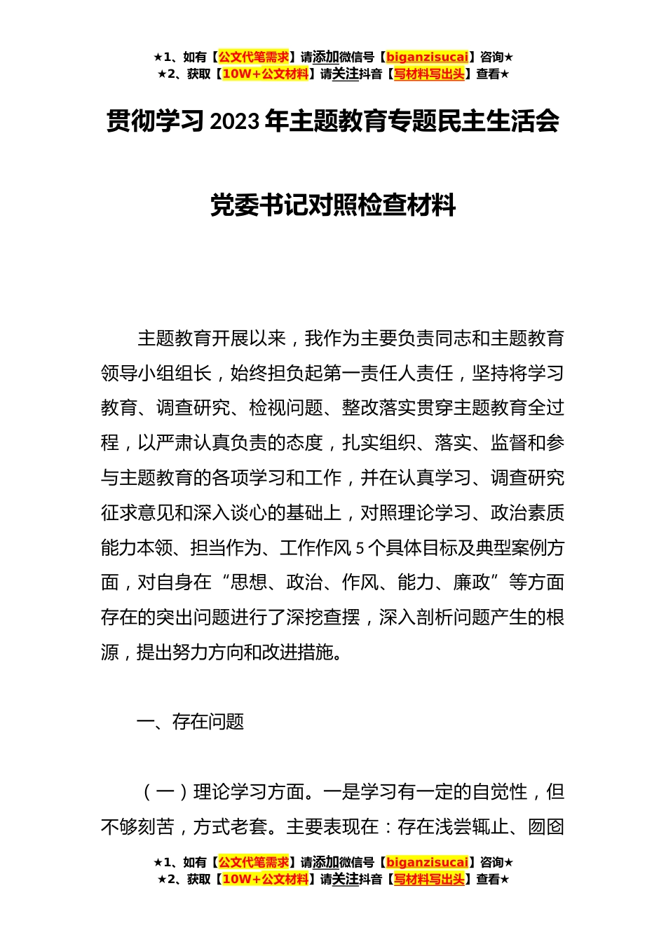★1、如有【公文代笔需求】请添加微信号【biganzisucai】咨询★★2、获取【10W+公文材料】请关注抖音【写材料写出头】查看★贯彻学习2023年主题教育专题民主生活会党委书记对照检查材料主题教育开展以来,我作为主要负责同志和主题教育领导小组组长,始终担负起第一责任人责任,坚持将学习教育、调查研究、检视问题、整改落实贯穿主题教育全过程,以严肃认真负责的态度,扎实组织、落实、监督和参与主题教育的各项学习和工作,并在认真学习、调查研究征求意见和深入谈心的基础上,对照理论学习、政治素质能力本领、担当作为、工作作风5个具体目标及典型案例方面,对自身在“思想、政治、作风、能力、廉政”等方面存在的突出问题进行了深挖查摆,深入剖析问题产生的根源,提出努力方向和改进措施。一、存在问题(一...