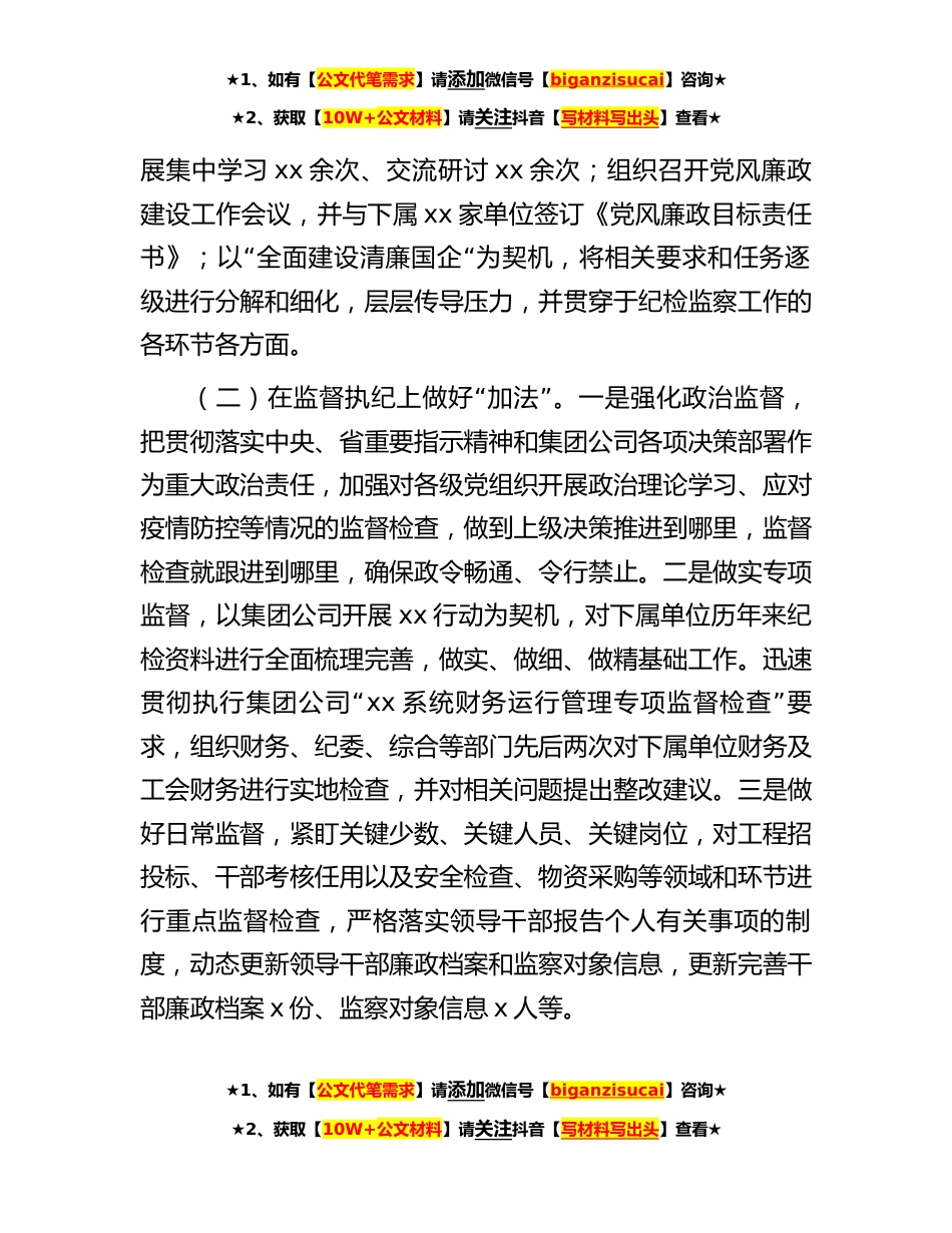 ★1、如有【公文代笔需求】请添加微信号【biganzisucai】咨询★★2、获取【10W+公文材料】请关注抖音【写材料写出头】查看★国企纪委半年工作总结讲政治勇担当聚合力保稳定以高质量纪检监察工作护航全面建设清廉xx公司改革发展新征程第一部分上半年工作总结xx年是公司改革重组的攻坚之年,也是公司转型发展步入正轨的关键之年。上半年,在xx集团党政的坚强领导下,公司纪检系统紧密围绕上级纪委行动计划及全面建设清廉国企等各项重点和中心工作任务,始终坚持把政治建设摆在首位,把监督职责落在实处,把纪律规矩挺在前面,持续强化不敢腐的震慑、扎牢不能腐的笼子、增强不想腐的自觉,充分运“”用加减乘除四则运算法与公司纪检监察工作相融合的方式,在公司营造了风清气正的政治环境和涵养了干事创业的政“”治...