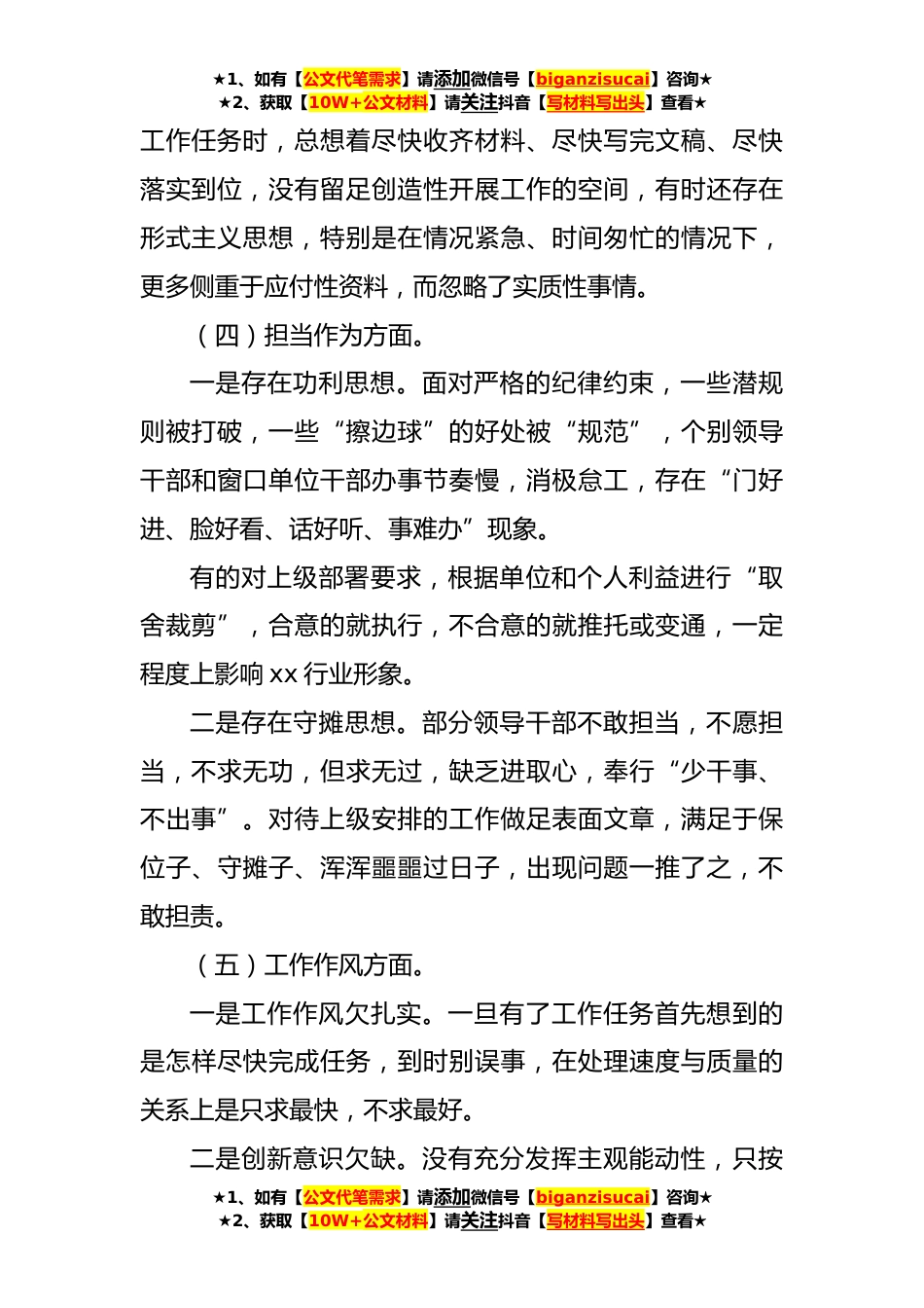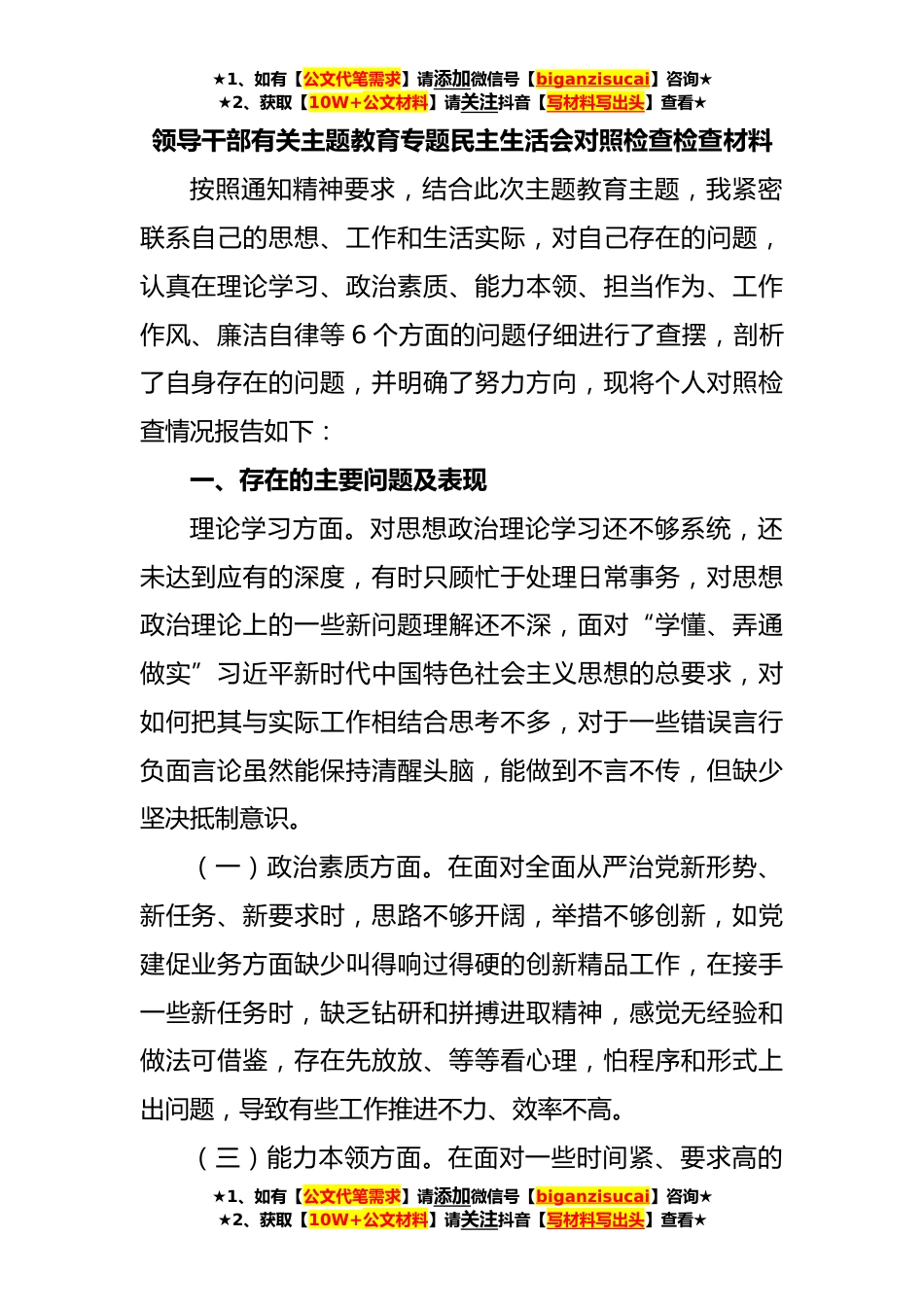 ★1、如有【公文代笔需求】请添加微信号【biganzisucai】咨询★★2、获取【10W+公文材料】请关注抖音【写材料写出头】查看★领导干部有关主题教育专题民主生活会对照检查检查材料按照通知精神要求,结合此次主题教育主题,我紧密联系自己的思想、工作和生活实际,对自己存在的问题,认真在理论学习、政治素质、能力本领、担当作为、工作作风、廉洁自律等6个方面的问题仔细进行了查摆,剖析了自身存在的问题,并明确了努力方向,现将个人对照检查情况报告如下:一、存在的主要问题及表现理论学习方面。对思想政治理论学习还不够系统,还未达到应有的深度,有时只顾忙于处理日常事务,对思想政治理论上的一些新问题理解还不深,面对“学懂、弄通做实”习近平新时代中国特色社会主义思想的总要求,对如何把其与实际工...
