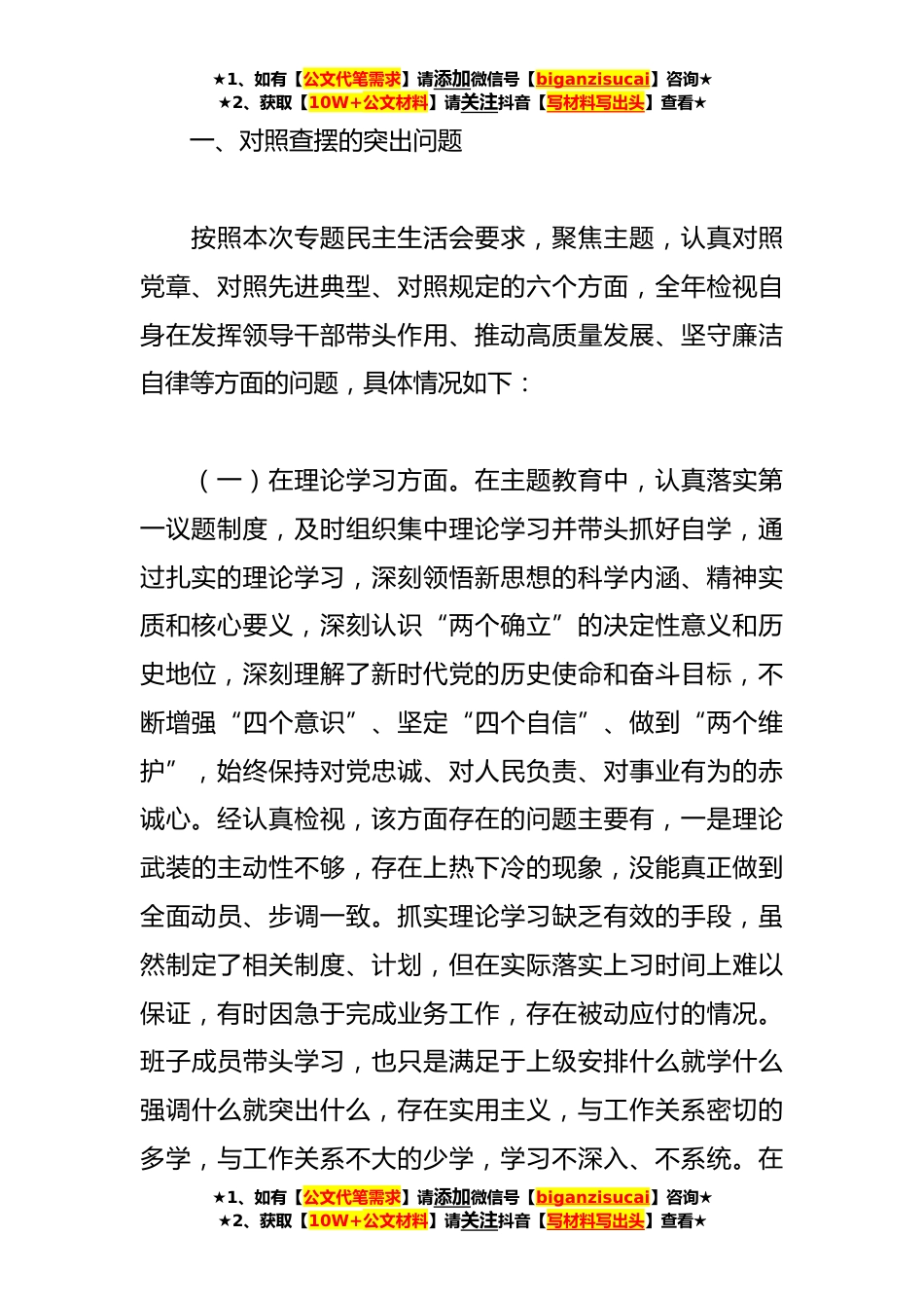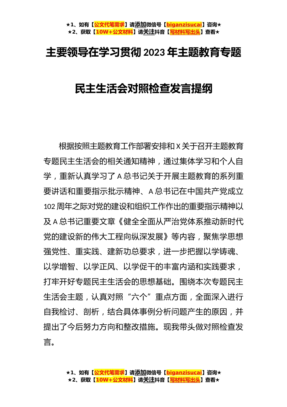 ★1、如有【公文代笔需求】请添加微信号【biganzisucai】咨询★★2、获取【10W+公文材料】请关注抖音【写材料写出头】查看★主要领导在学习贯彻2023年主题教育专题民主生活会对照检查发言提纲根据按照主题教育工作部署安排和X关于召开主题教育专题民主生活会的相关通知精神,通过集体学习和个人自学,重新认真学习了A总书记关于开展主题教育的系列重要讲话和重要指示批示精神、A总书记在中国共产党成立102周年之际对党的建设和组织工作作出的重要指示精神以及A总书记重要文章《健全全面从严治党体系推动新时代党的建设新的伟大工程向纵深发展》等内容,聚焦学思想强党性、重实践、建新功总要求,进一步把握以学铸魂、以学增智、以学正风、以学促干的丰富内涵和实践要求,打牢开好专题民主生活会的思想基础。围绕本...