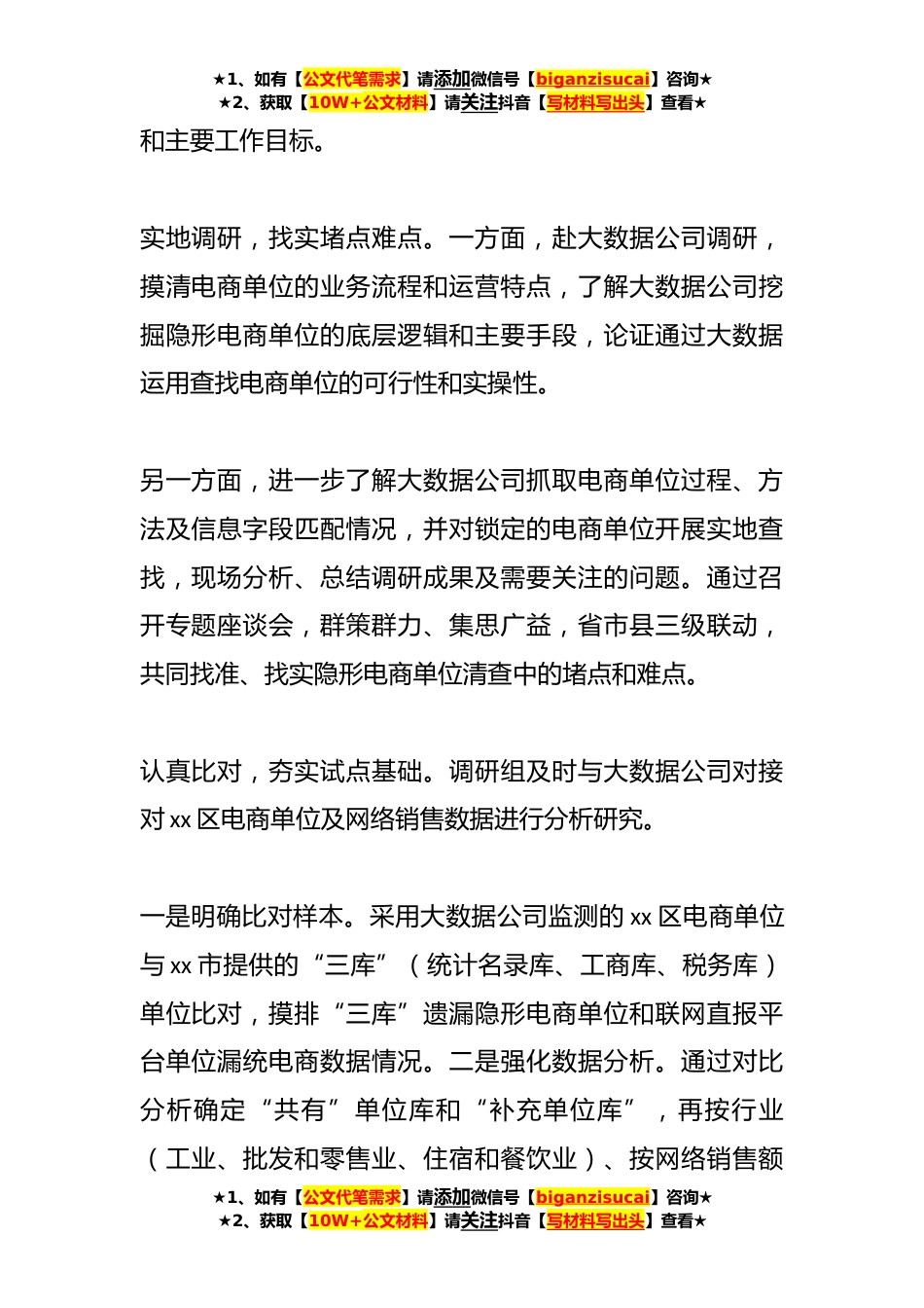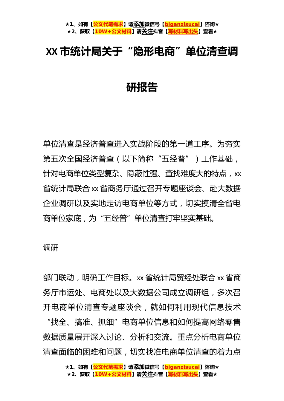 ★1、如有【公文代笔需求】请添加微信号【biganzisucai】咨询★★2、获取【10W+公文材料】请关注抖音【写材料写出头】查看★XX市统计局关于“隐形电商”单位清查调研报告单位清查是经济普查进入实战阶段的第一道工序。为夯实第五次全国经济普查(以下简称“五经普”)工作基础,针对电商单位类型复杂、隐蔽性强、查找难度大的特点,xx省统计局联合xx省商务厅通过召开专题座谈会、赴大数据企业调研以及实地走访电商单位等方式,切实摸清全省电商单位家底,为“五经普”单位清查打牢坚实基础。调研部门联动,明确工作目标。xx省统计局贸经处联合xx省商务厅市运处、电商处以及大数据公司成立调研组,多次召开电商单位清查专题座谈会,就如何利用现代信息技术“找全、搞准、抓细”电商单位信息和如何提高网络零售数据...