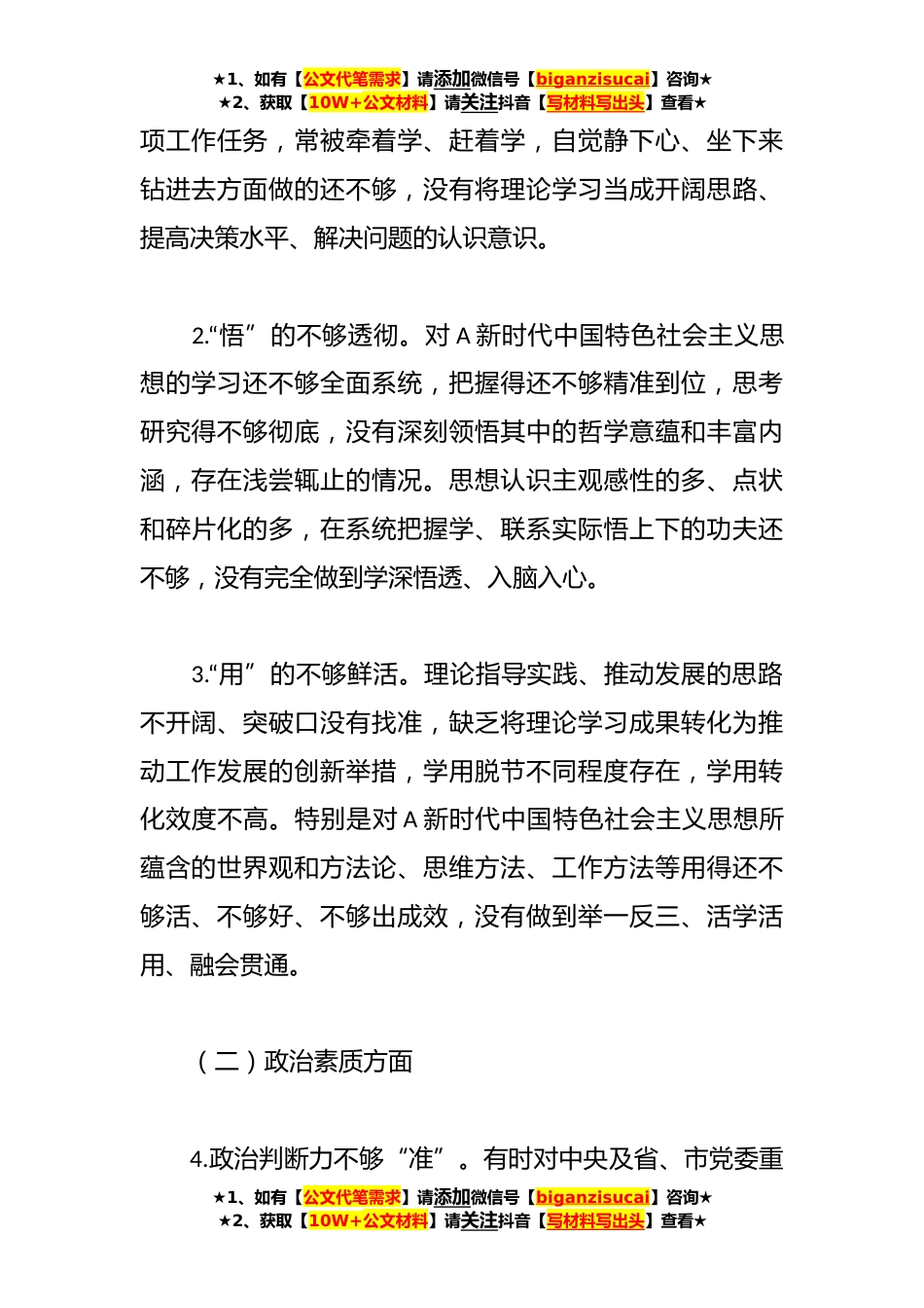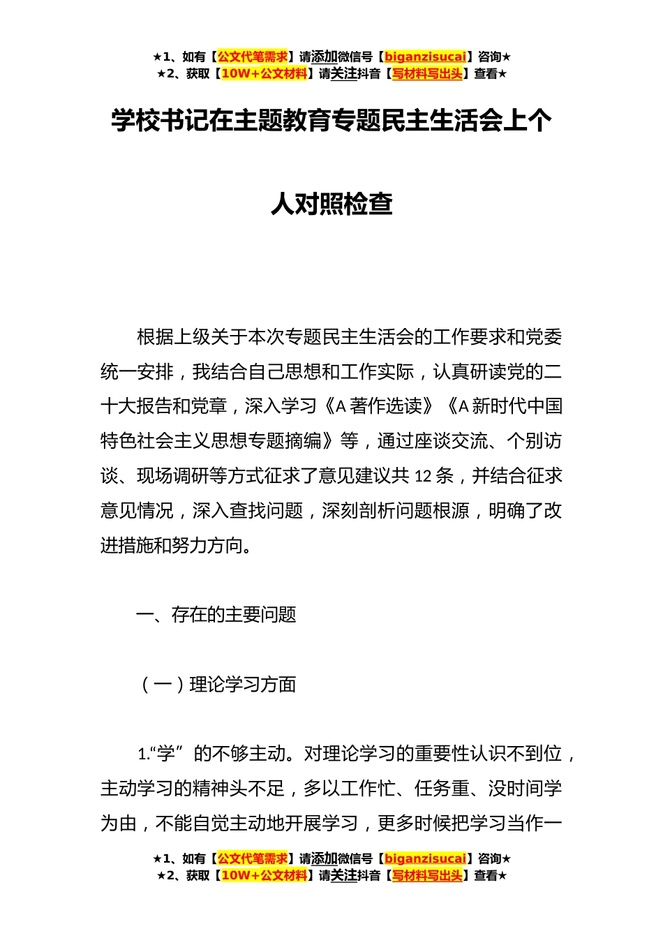 ★1、如有【公文代笔需求】请添加微信号【biganzisucai】咨询★★2、获取【10W+公文材料】请关注抖音【写材料写出头】查看★学校书记在主题教育专题民主生活会上个人对照检查根据上级关于本次专题民主生活会的工作要求和党委统一安排,我结合自己思想和工作实际,认真研读党的二十大报告和党章,深入学习《A著作选读》《A新时代中国特色社会主义思想专题摘编》等,通过座谈交流、个别访谈、现场调研等方式征求了意见建议共12条,并结合征求意见情况,深入查找问题,深刻剖析问题根源,明确了改进措施和努力方向。一、存在的主要问题(一)理论学习方面1.“学”的不够主动。对理论学习的重要性认识不到位,主动学习的精神头不足,多以工作忙、任务重、没时间学为由,不能自觉主动地开展学习,更多时候把学习当作一...