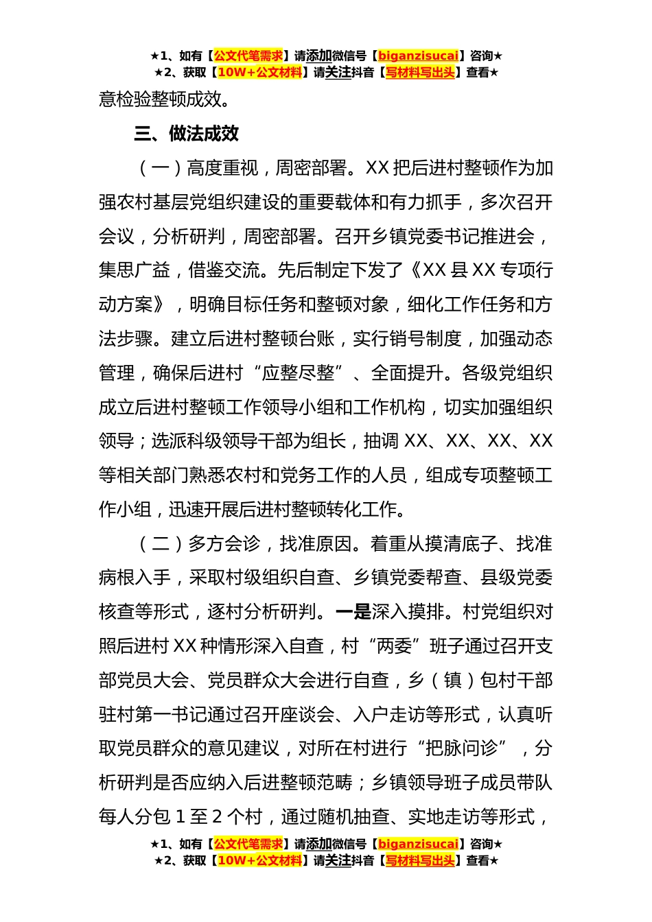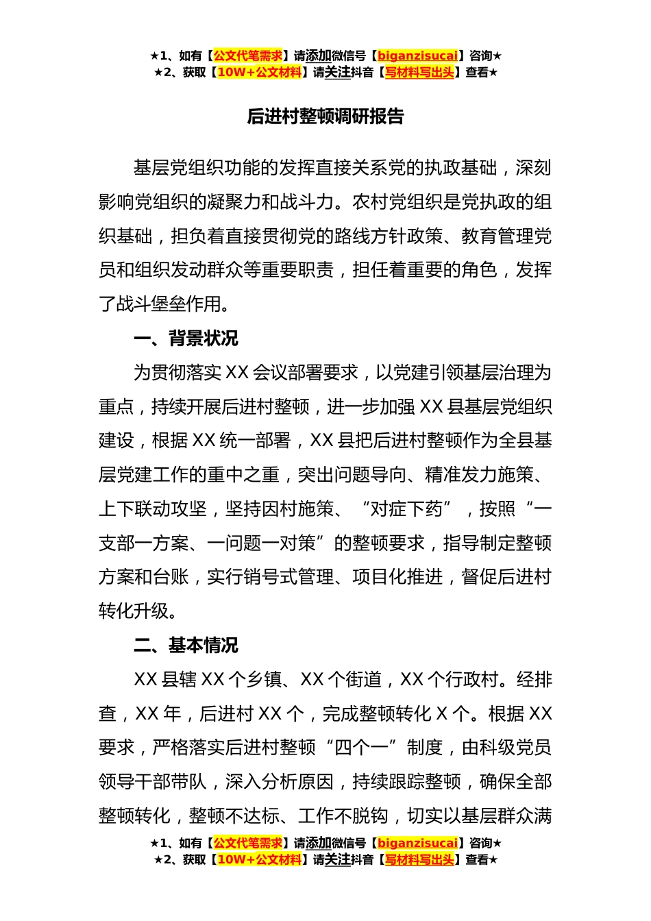★1、如有【公文代笔需求】请添加微信号【biganzisucai】咨询★★2、获取【10W+公文材料】请关注抖音【写材料写出头】查看★后进村整顿调研报告基层党组织功能的发挥直接关系党的执政基础,深刻影响党组织的凝聚力和战斗力。农村党组织是党执政的组织基础,担负着直接贯彻党的路线方针政策、教育管理党员和组织发动群众等重要职责,担任着重要的角色,发挥了战斗堡垒作用。一、背景状况为贯彻落实XX会议部署要求,以党建引领基层治理为重点,持续开展后进村整顿,进一步加强XX县基层党组织建设,根据XX统一部署,XX县把后进村整顿作为全县基层党建工作的重中之重,突出问题导向、精准发力施策、上下联动攻坚,坚持因村施策、“对症下药”,按照“一支部一方案、一问题一对策”的整顿要求,指导制定整顿方案和台账...