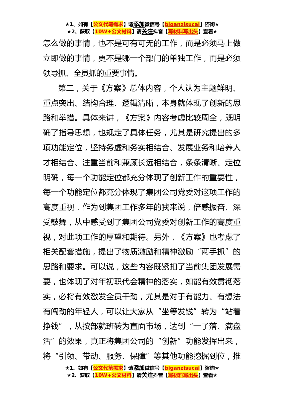★1、如有【公文代笔需求】请添加微信号【biganzisucai】咨询★★2、获取【10W+公文材料】请关注抖音【写材料写出头】查看★在《集团创新工作方案》讨论会上的发言材料根据工作安排,昨天,我认真学习了集团公司下发的《创新工作方案》,在通读全文的基础上,结合到集团工作以来掌握的情况、近期陪同调研了解的情况以及自身实际,作如下交流发言,不妥之处,敬请批评指正。第一,关于开展创新这项工作,个人认为非常必要、正当其时、极为重要,深刻感受到了集团公司党委推动高质量发展的信心和决心。主要体现在三个方面,一是从集团职责使命看,作为全省省属国企中唯一一家立足地方、辐射全国的科技企业,开展创新是履行职责、践行使命的一项重要抓手,包括理念的创新、平台的创新、经营思路的创新等等都不可或缺...