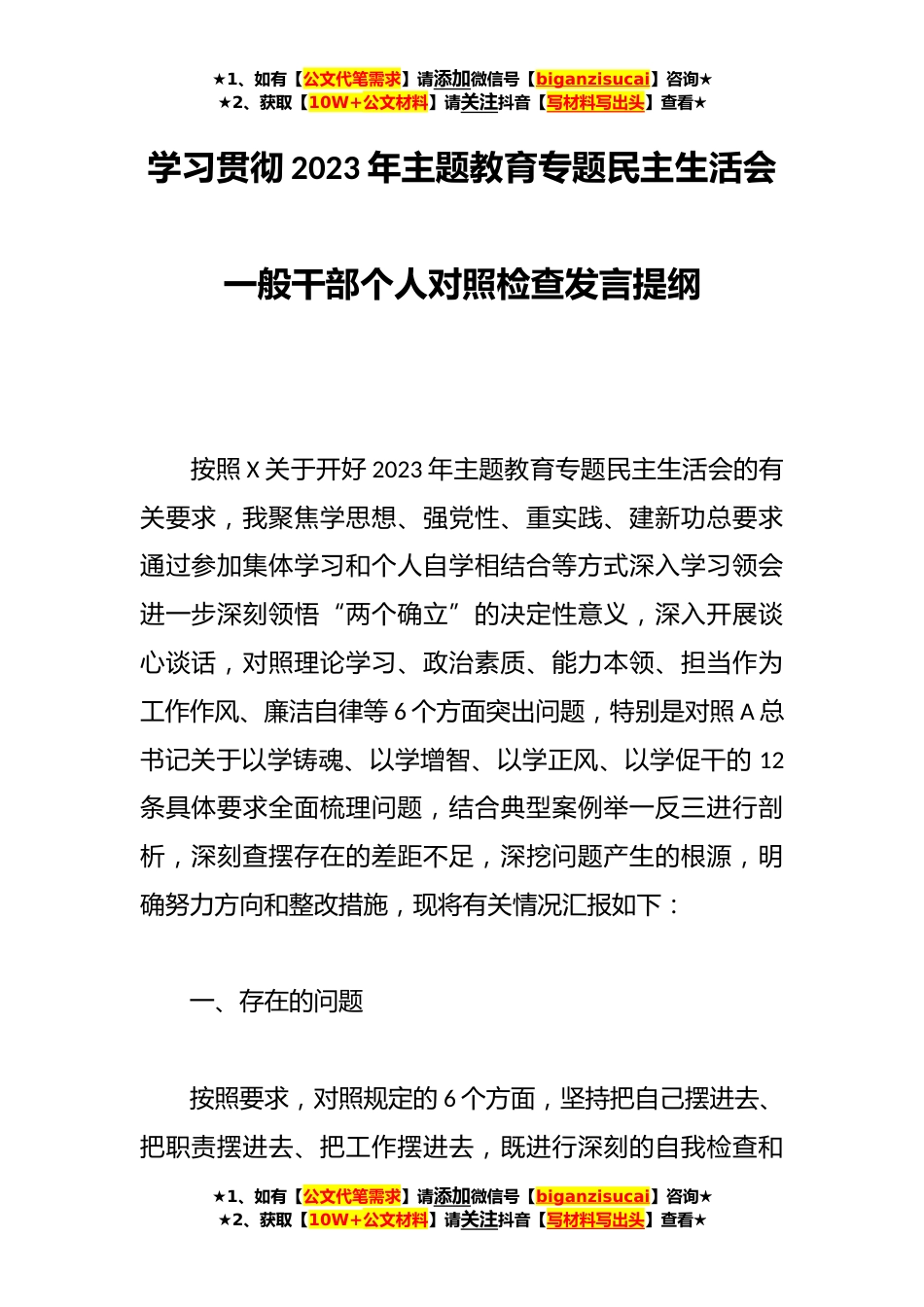 ★1、如有【公文代笔需求】请添加微信号【biganzisucai】咨询★★2、获取【10W+公文材料】请关注抖音【写材料写出头】查看★学习贯彻2023年主题教育专题民主生活会一般干部个人对照检查发言提纲按照X关于开好2023年主题教育专题民主生活会的有关要求,我聚焦学思想、强党性、重实践、建新功总要求通过参加集体学习和个人自学相结合等方式深入学习领会进一步深刻领悟“两个确立”的决定性意义,深入开展谈心谈话,对照理论学习、政治素质、能力本领、担当作为工作作风、廉洁自律等6个方面突出问题,特别是对照A总书记关于以学铸魂、以学增智、以学正风、以学促干的12条具体要求全面梳理问题,结合典型案例举一反三进行剖析,深刻查摆存在的差距不足,深挖问题产生的根源,明确努力方向和整改措施,现将有关情况汇报...