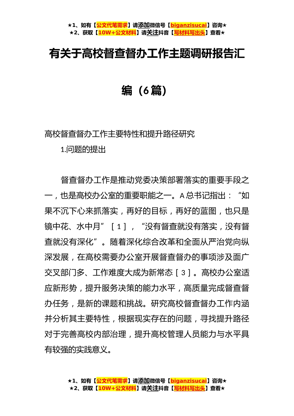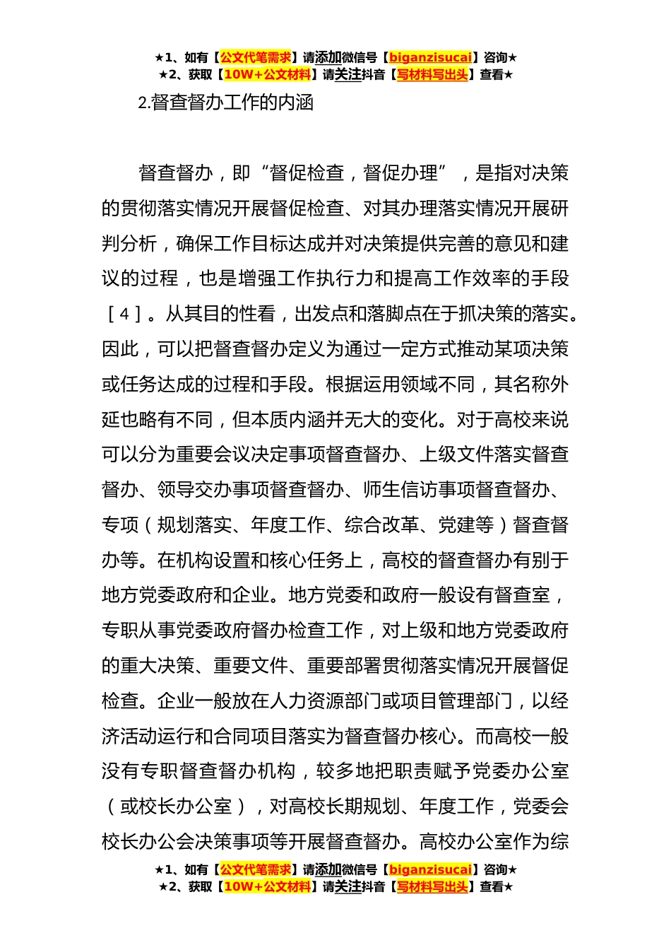 ★1、如有【公文代笔需求】请添加微信号【biganzisucai】咨询★★2、获取【10W+公文材料】请关注抖音【写材料写出头】查看★有关于高校督查督办工作主题调研报告汇编(6篇)高校督查督办工作主要特性和提升路径研究1.问题的提出督查督办工作是推动党委决策部署落实的重要手段之一,也是高校办公室的重要职能之一。A总书记指出:“如果不沉下心来抓落实,再好的目标,再好的蓝图,也只是镜中花、水中月”[1],“没有督查就没有落实,没有督查就没有深化”。随着深化综合改革和全面从严治党向纵深发展,在高校需要办公室开展督查督办的事项涉及面广交叉部门多、工作难度大成为新常态[3]。高校办公室适应新形势,提升服务决策的能力水平,高质量完成督查督办任务,是新的课题和挑战。研究高校督查督办工作内涵并...