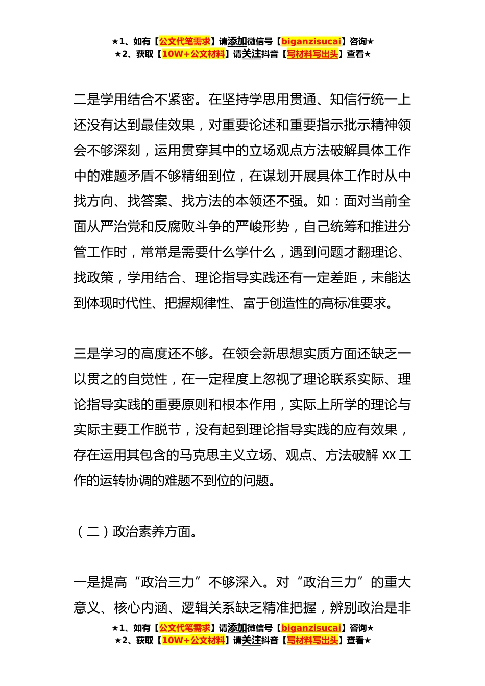 ★1、如有【公文代笔需求】请添加微信号【biganzisucai】咨询★★2、获取【10W+公文材料】请关注抖音【写材料写出头】查看★2023年主题教育民主生活会领导干部个人对照检查发言提纲按照本次主题教育专题民主生活会的要求,我在深入学习研讨、广泛征求意见、深入开展谈心谈话的基础上,紧扣会议主题,对照“六个方面”,深入查摆自身存在的问题深刻剖析思想根源,明确了整改措施。现作对照检查如下:一、存在问题(一)理论学习方面。一是理论学习缺深度。对照关于以学以学铸魂、以学增智以学正风、以学促干的要求,在全面学习中深化对高质量发展的理解和认识还不够到位,督促指导各党组织利用“三会一课”、主题党日、专题培训等方式深化理论学习不够,对最新党的政策理论的整体性把握还有不足,存在急用急学、现...