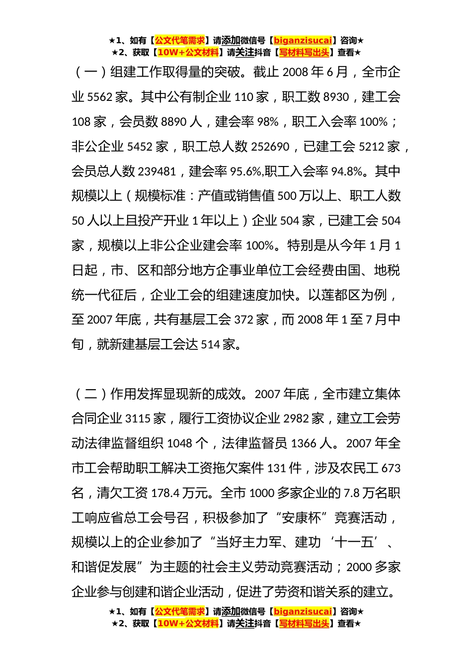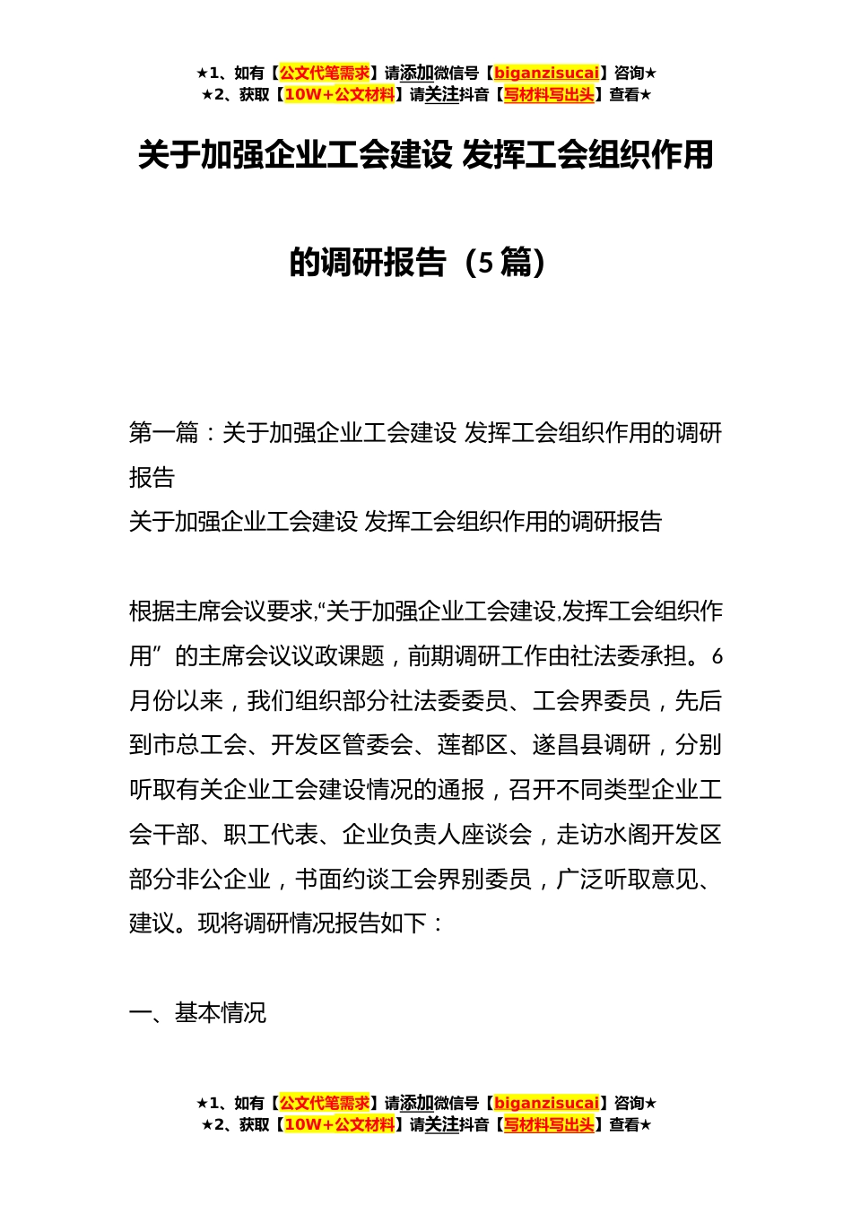 ★1、如有【公文代笔需求】请添加微信号【biganzisucai】咨询★★2、获取【10W+公文材料】请关注抖音【写材料写出头】查看★关于加强企业工会建设发挥工会组织作用的调研报告(5篇)第一篇:关于加强企业工会建设发挥工会组织作用的调研报告关于加强企业工会建设发挥工会组织作用的调研报告根据主席会议要求,“关于加强企业工会建设,发挥工会组织作用”的主席会议议政课题,前期调研工作由社法委承担。6月份以来,我们组织部分社法委委员、工会界委员,先后到市总工会、开发区管委会、莲都区、遂昌县调研,分别听取有关企业工会建设情况的通报,召开不同类型企业工会干部、职工代表、企业负责人座谈会,走访水阁开发区部分非公企业,书面约谈工会界别委员,广泛听取意见、建议。现将调研情况报告如下:一、基本情...