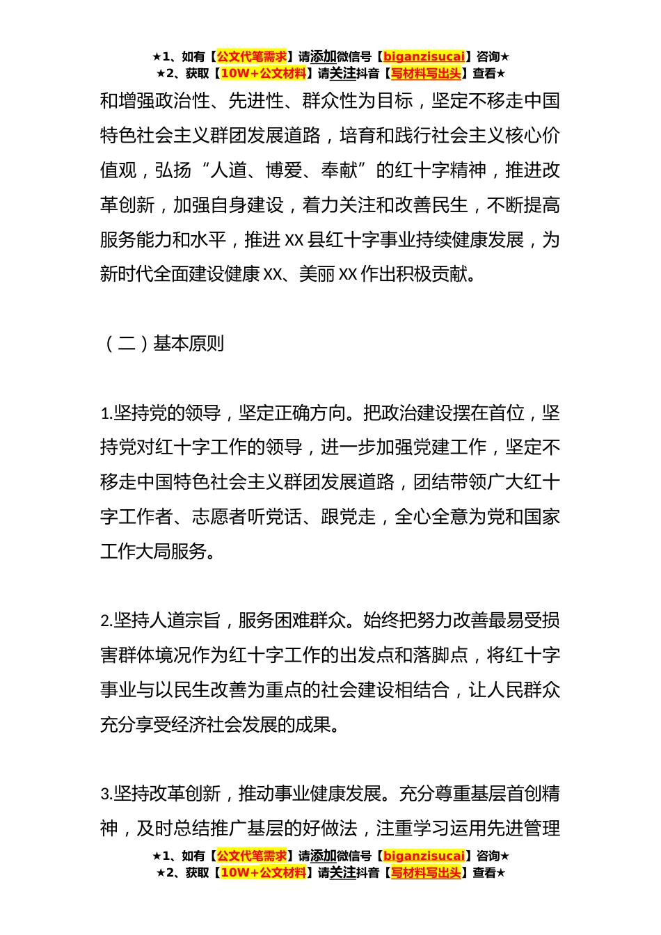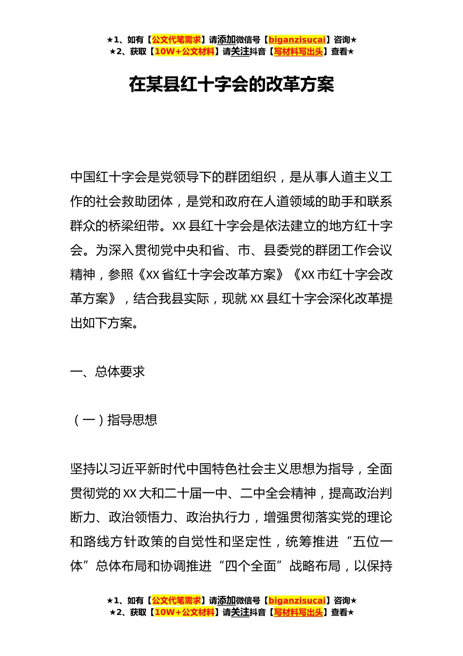 ★1、如有【公文代笔需求】请添加微信号【biganzisucai】咨询★★2、获取【10W+公文材料】请关注抖音【写材料写出头】查看★在某县红十字会的改革方案中国红十字会是党领导下的群团组织,是从事人道主义工作的社会救助团体,是党和政府在人道领域的助手和联系群众的桥梁纽带。XX县红十字会是依法建立的地方红十字会。为深入贯彻党中央和省、市、县委党的群团工作会议精神,参照《XX省红十字会改革方案》《XX市红十字会改革方案》,结合我县实际,现就XX县红十字会深化改革提出如下方案。一、总体要求(一)指导思想坚持以习近平新时代中国特色社会主义思想为指导,全面贯彻党的XX大和二十届一中、二中全会精神,提高政治判断力、政治领悟力、政治执行力,增强贯彻落实党的理论和路线方针政策的自觉性和坚定性,统...