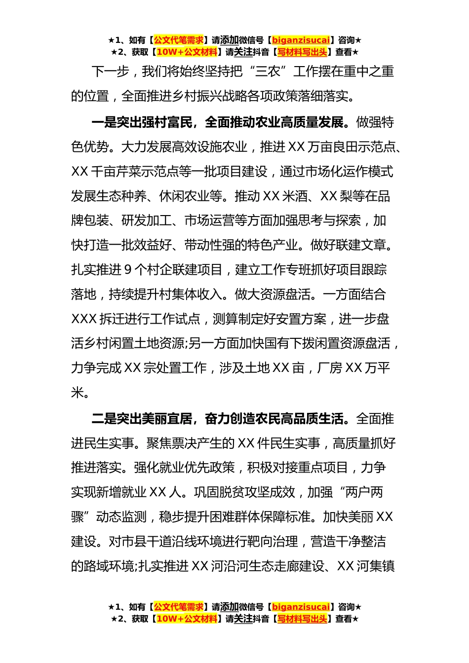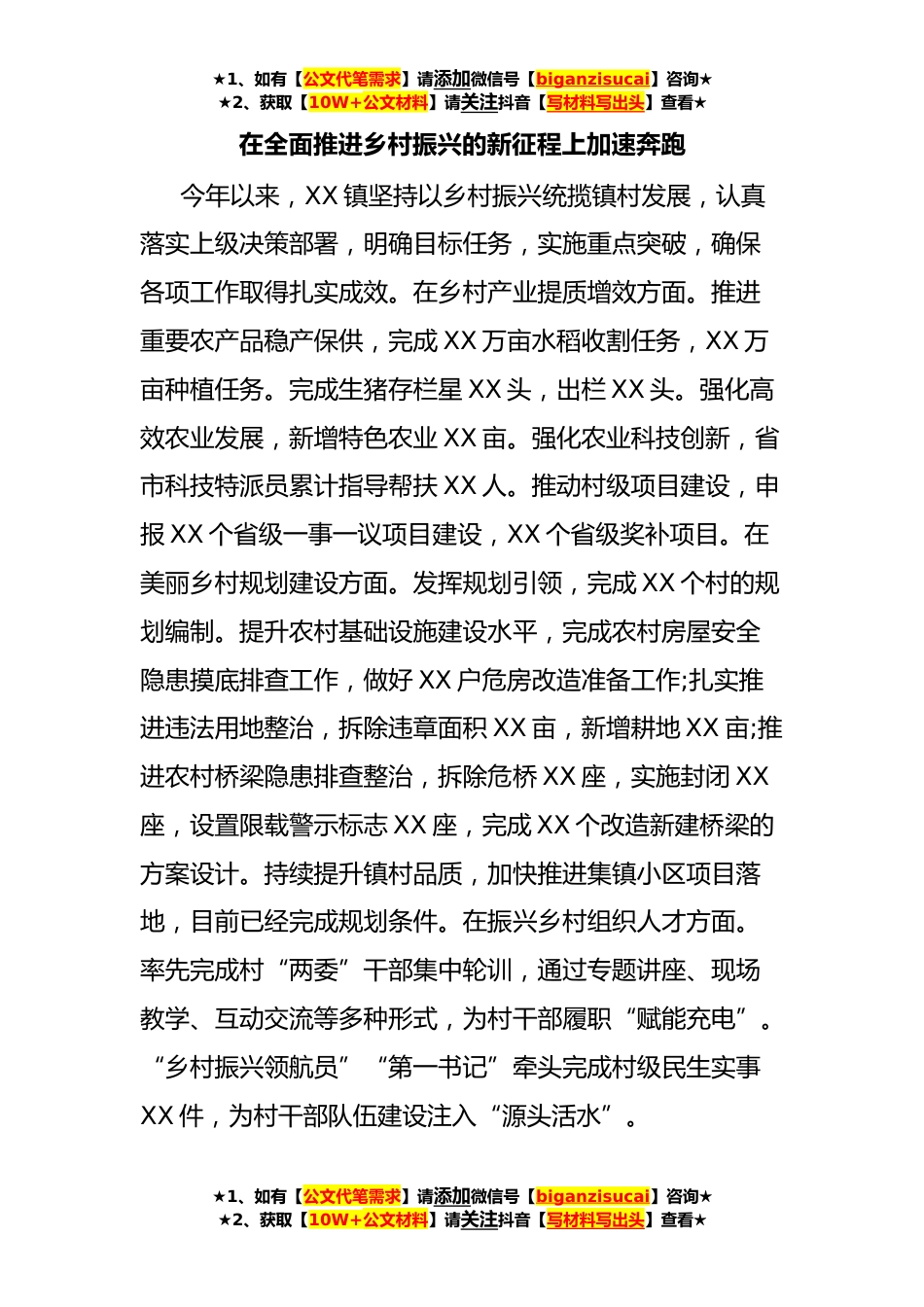★1、如有【公文代笔需求】请添加微信号【biganzisucai】咨询★★2、获取【10W+公文材料】请关注抖音【写材料写出头】查看★在全面推进乡村振兴的新征程上加速奔跑今年以来,XX镇坚持以乡村振兴统揽镇村发展,认真落实上级决策部署,明确目标任务,实施重点突破,确保各项工作取得扎实成效。在乡村产业提质增效方面。推进重要农产品稳产保供,完成XX万亩水稻收割任务,XX万亩种植任务。完成生猪存栏星XX头,出栏XX头。强化高效农业发展,新增特色农业XX亩。强化农业科技创新,省市科技特派员累计指导帮扶XX人。推动村级项目建设,申报XX个省级一事一议项目建设,XX个省级奖补项目。在美丽乡村规划建设方面。发挥规划引领,完成XX个村的规划编制。提升农村基础设施建设水平,完成农村房屋安全隐患摸底排查工作,做...